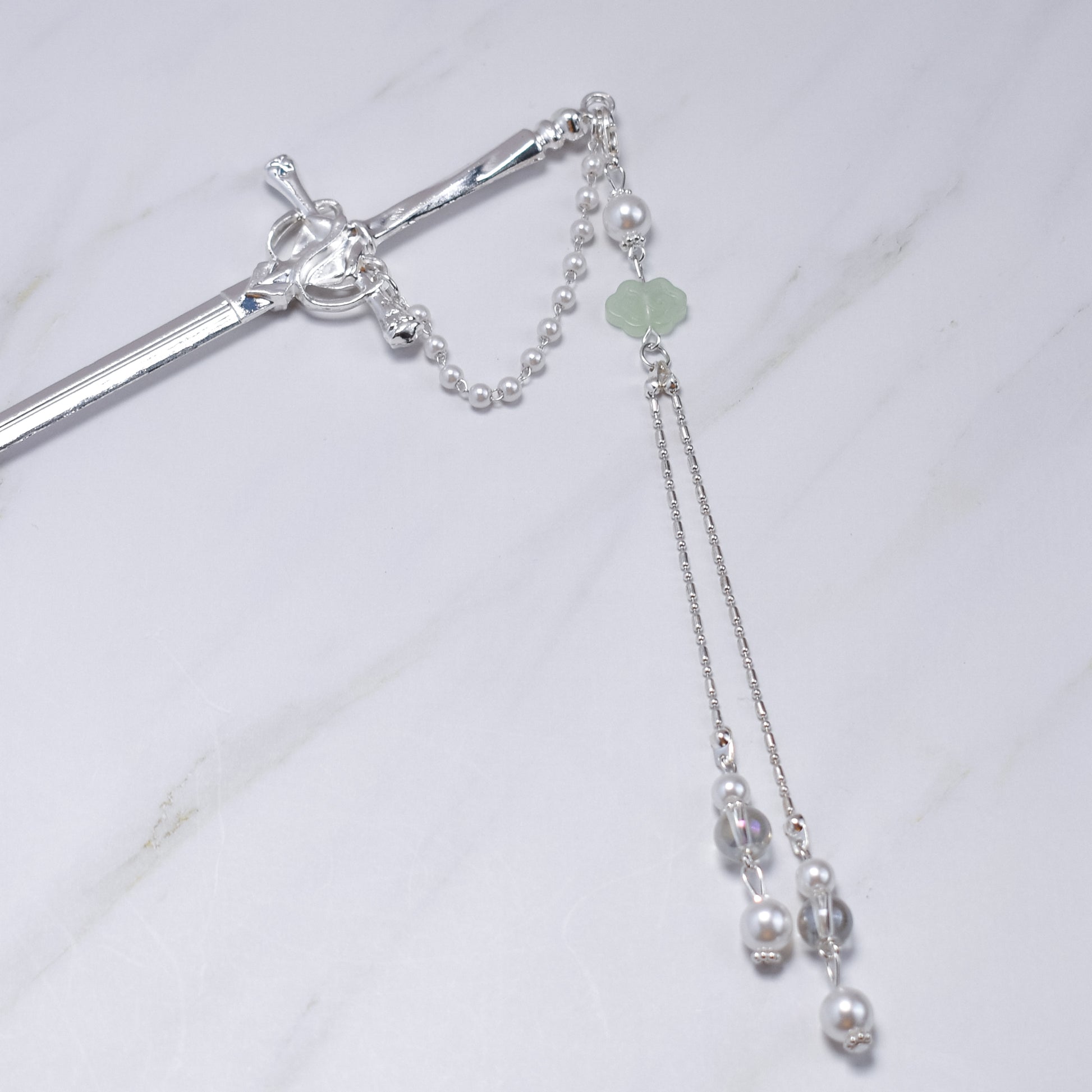 Moonlit Pearl Sword Hairpin – Silver Blade with Pearls & Jade Blossom Accent