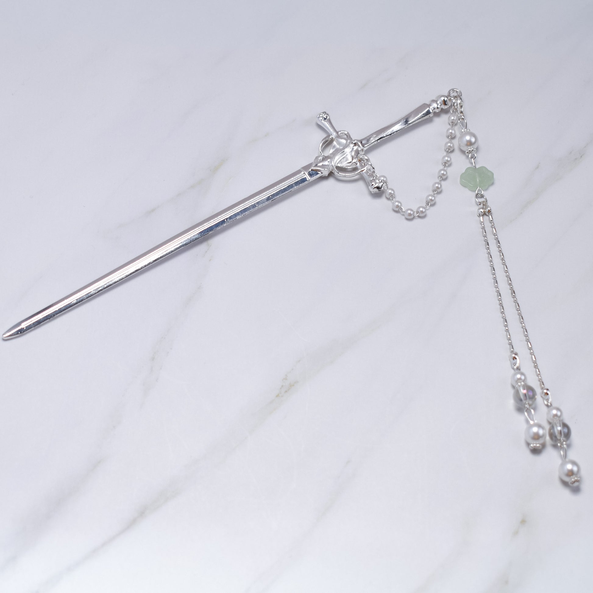 The polished silver sword hairpin features a clean, reflective blade and a traditional cross-guard design. Draped from the top is a cascading arrangement of: