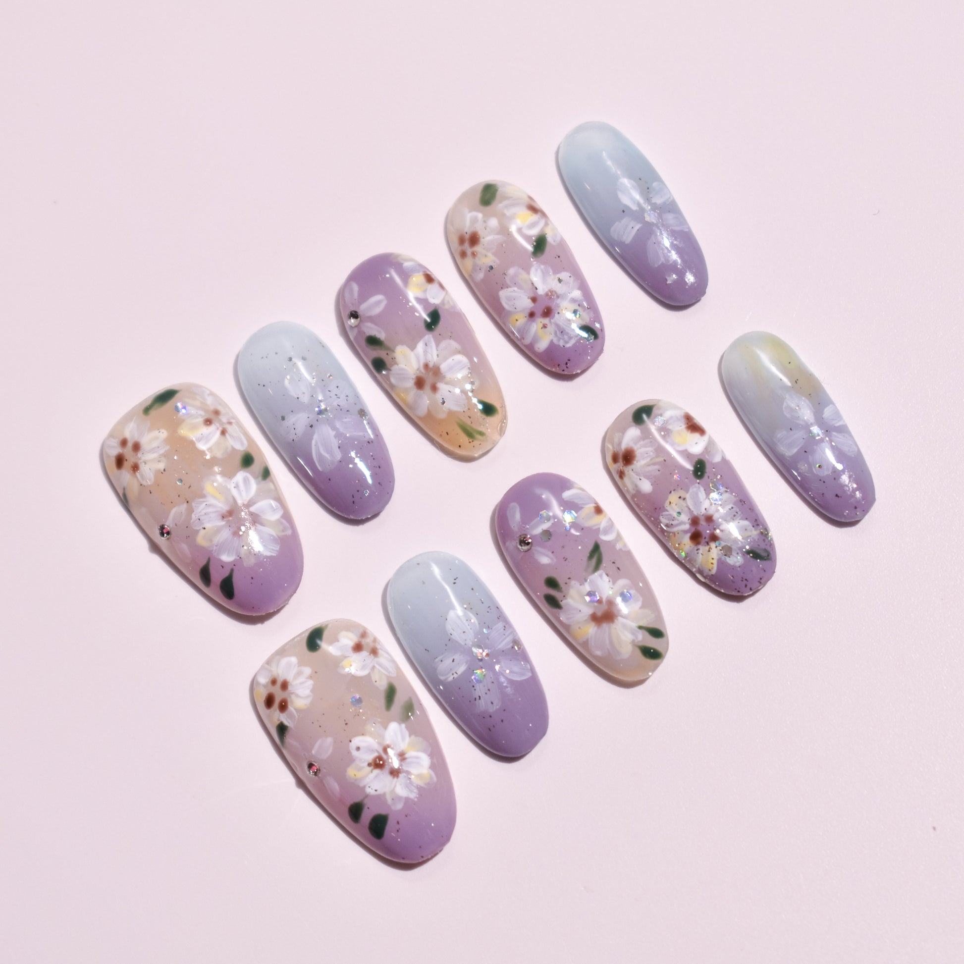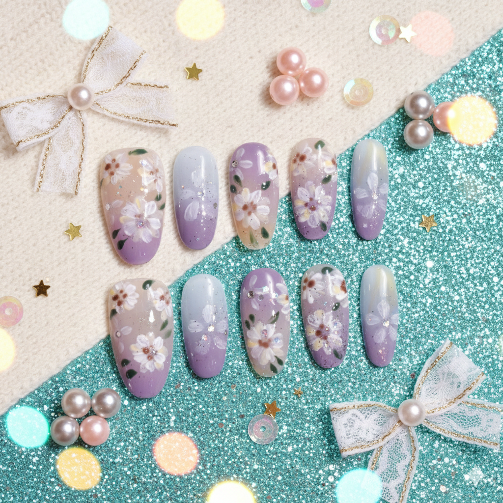 Step into a "Murasaki no Yume" (Purple Dream), where the misty twilight of a high-mountain meadow meets the first frost of spring. This design captures the ephemeral beauty of wildflowers blooming through a soft, hazy fog. It is a poetic tribute to the delicate balance of nature, blending ethereal gradients with hand-painted artistry to create a look that feels like a wearable watercolor painting.