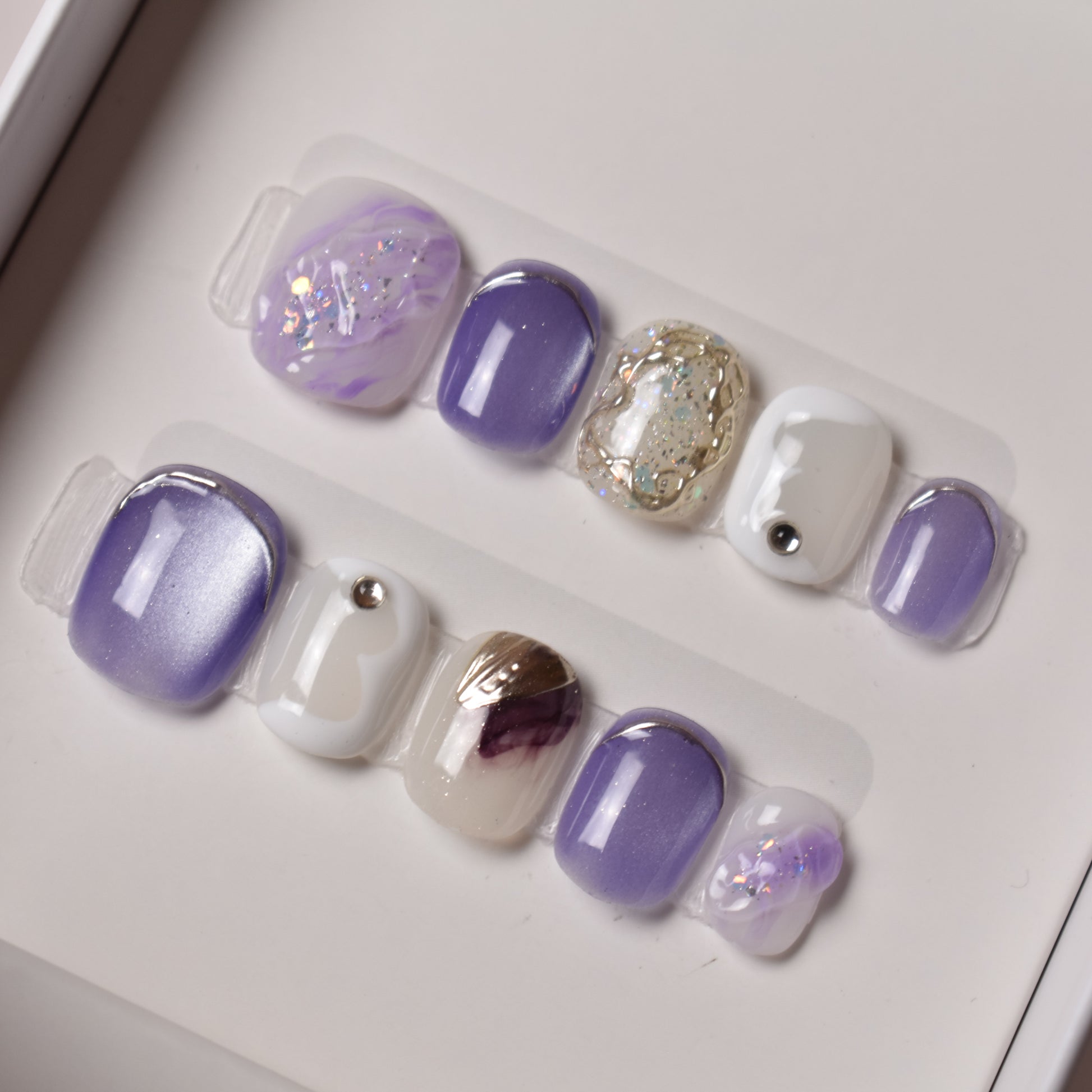 Gentle lavender gradients meet pearlescent whites, accented with iridescent glitters and marbled swirls. Like twilight skies laced with clouds, this dreamy design is perfect for serene elegance.