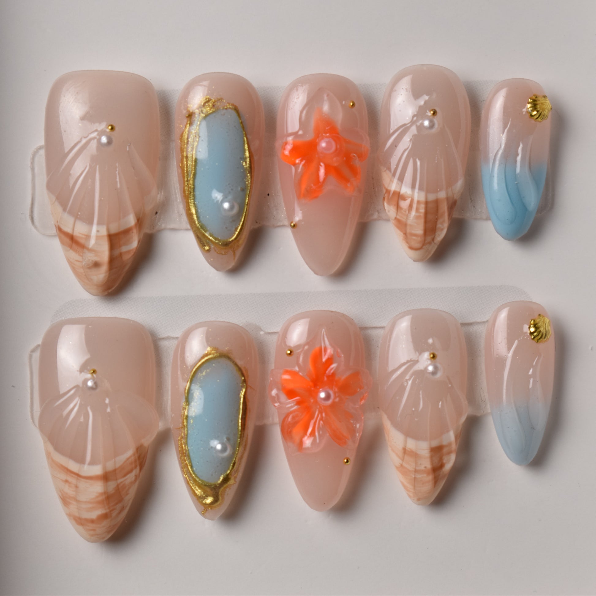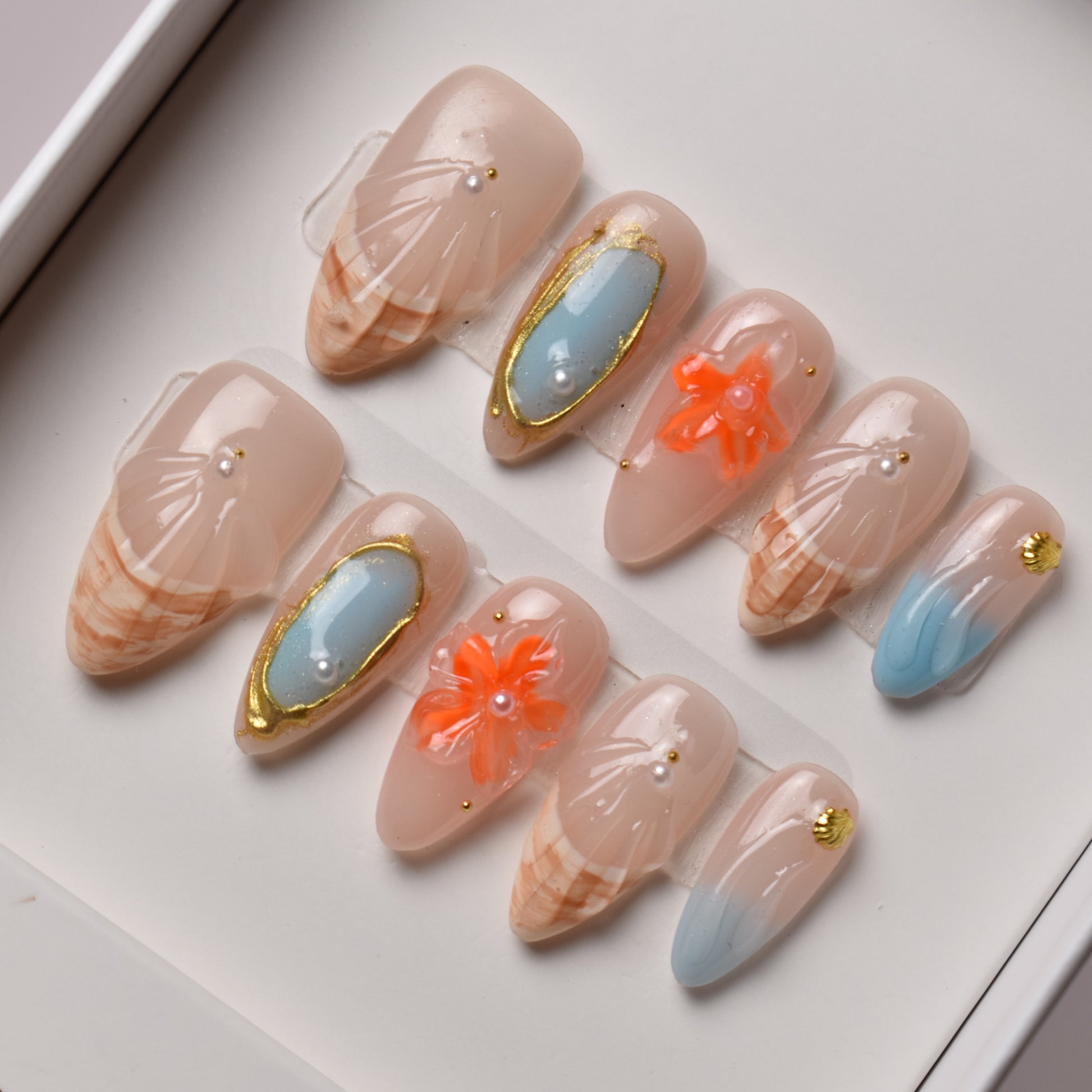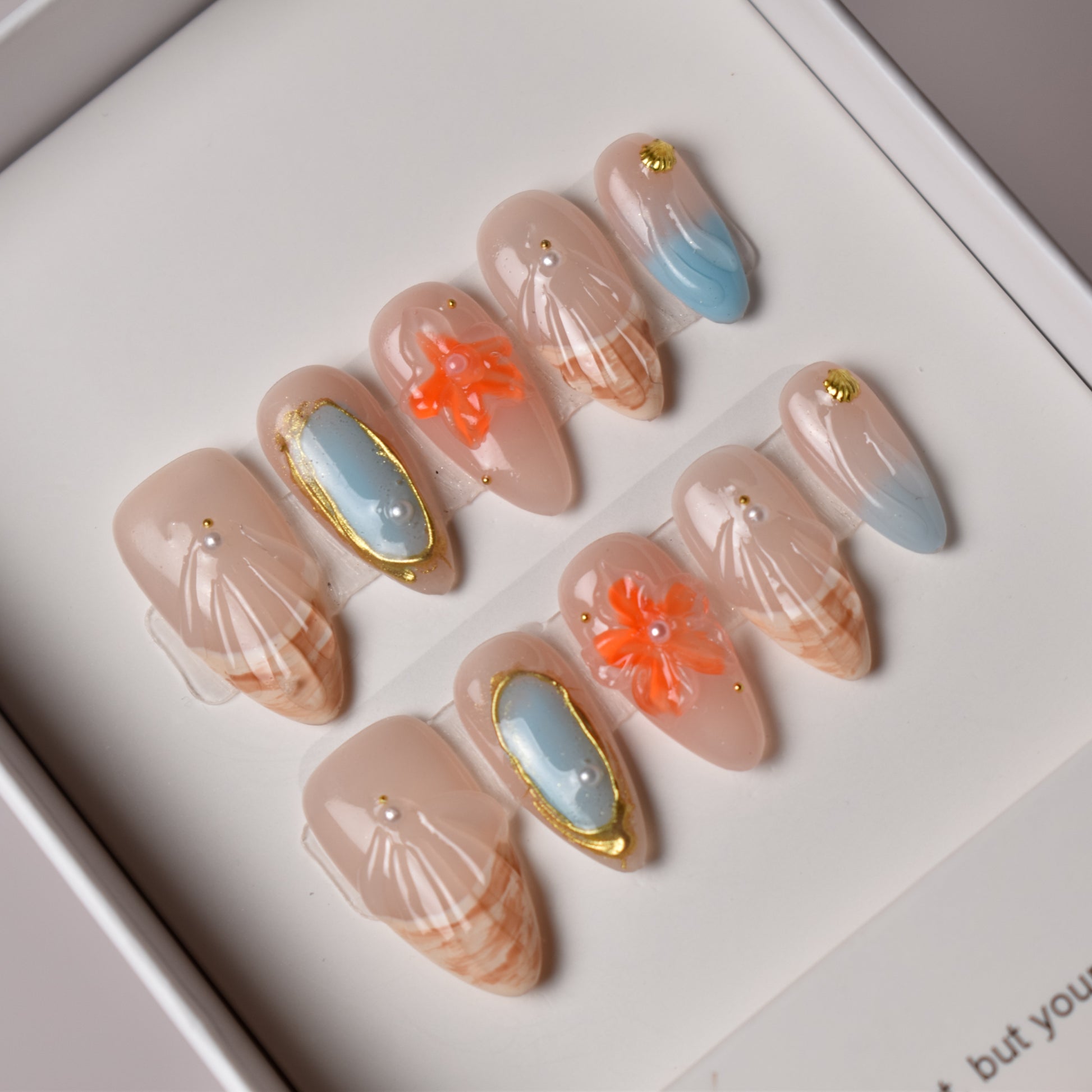A breezy mix of seashell textures, coral-orange 3D flowers, and sky-blue accents brings this set to life. Nude bases with sandy gradients evoke warm shores, while golden frames and pearl embellishments add a hint of luxury. Perfect for beach vacations, tropical escapes, and summer festivals under the sun.