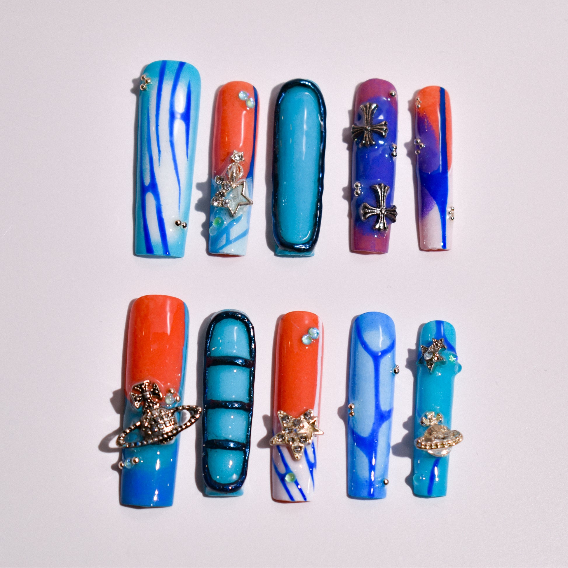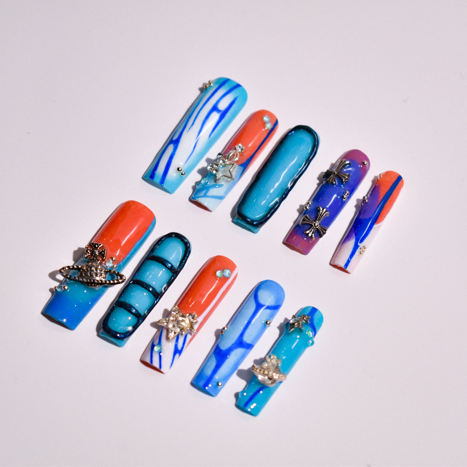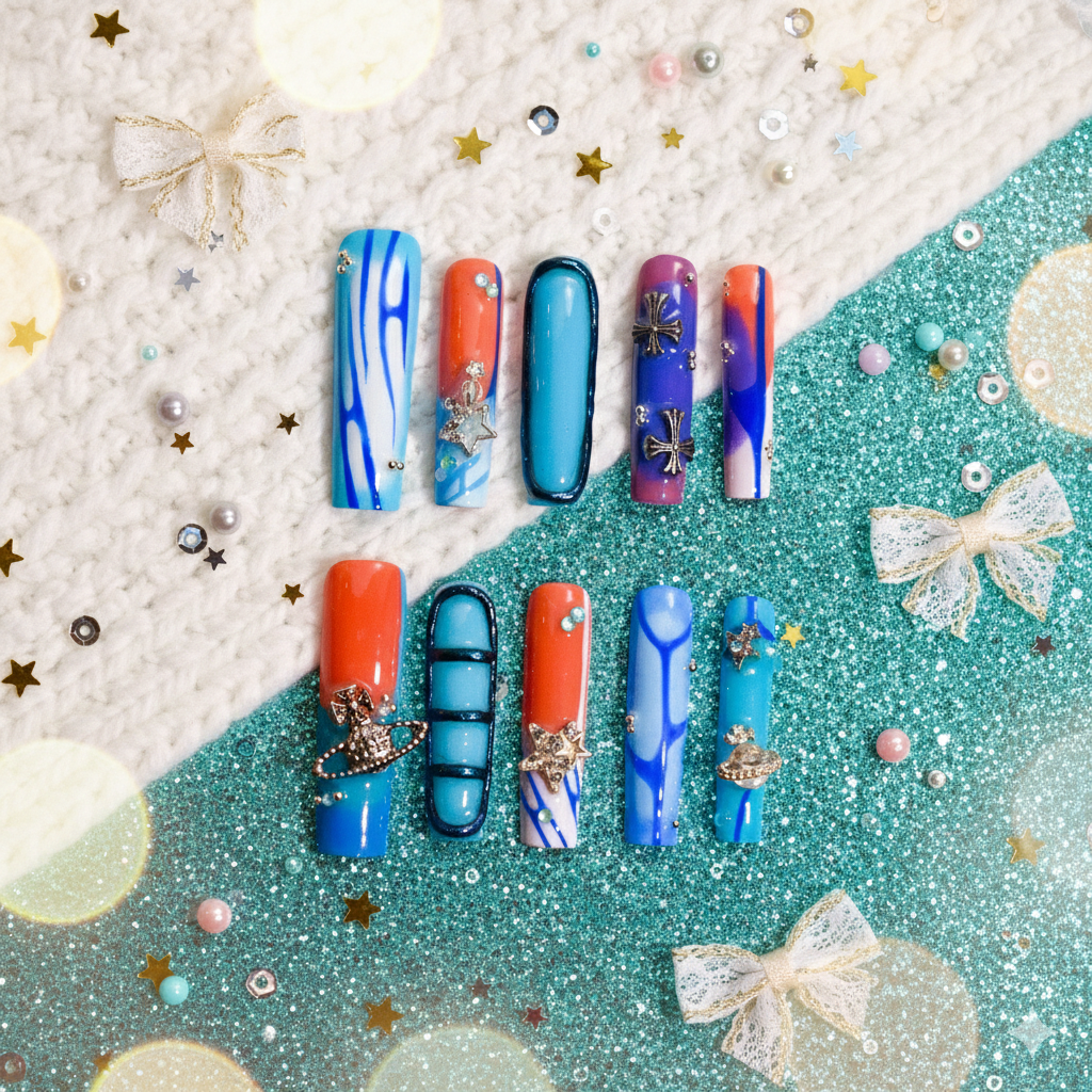 Make a statement that’s impossible to ignore with Neon Orbit XL, an extra-long square press-on nail set designed for bold, confident energy. This set features a striking mix of electric aqua blue, cobalt, and fiery orange, layered with fluid abstract lines and gradient blends that feel futuristic and cosmic. High-shine finishes amplify the color payoff, while 3D silver celestial charms—including stars, planets, and crosses—add depth, texture, and a luxe edge.