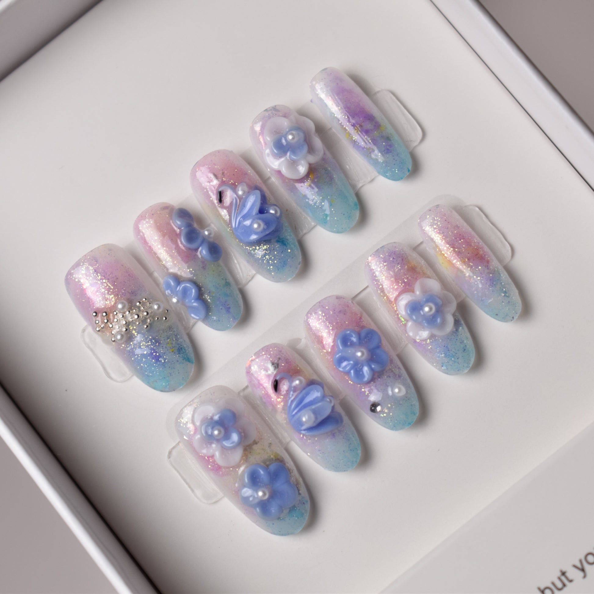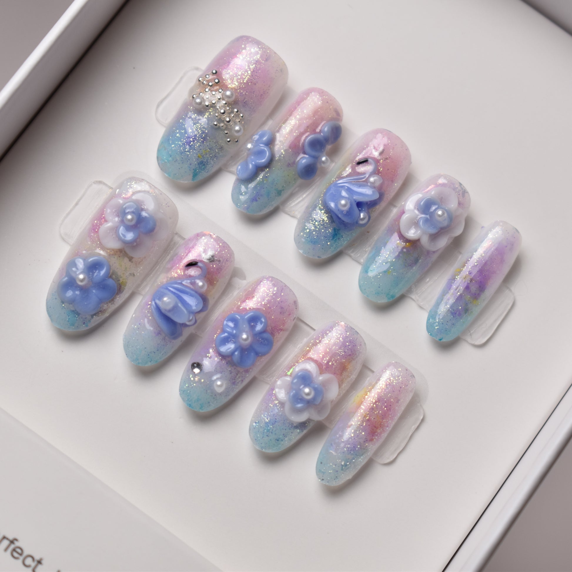 - 10 uniquely designed, hand-painted press-on nails made with high-quality UV gel.