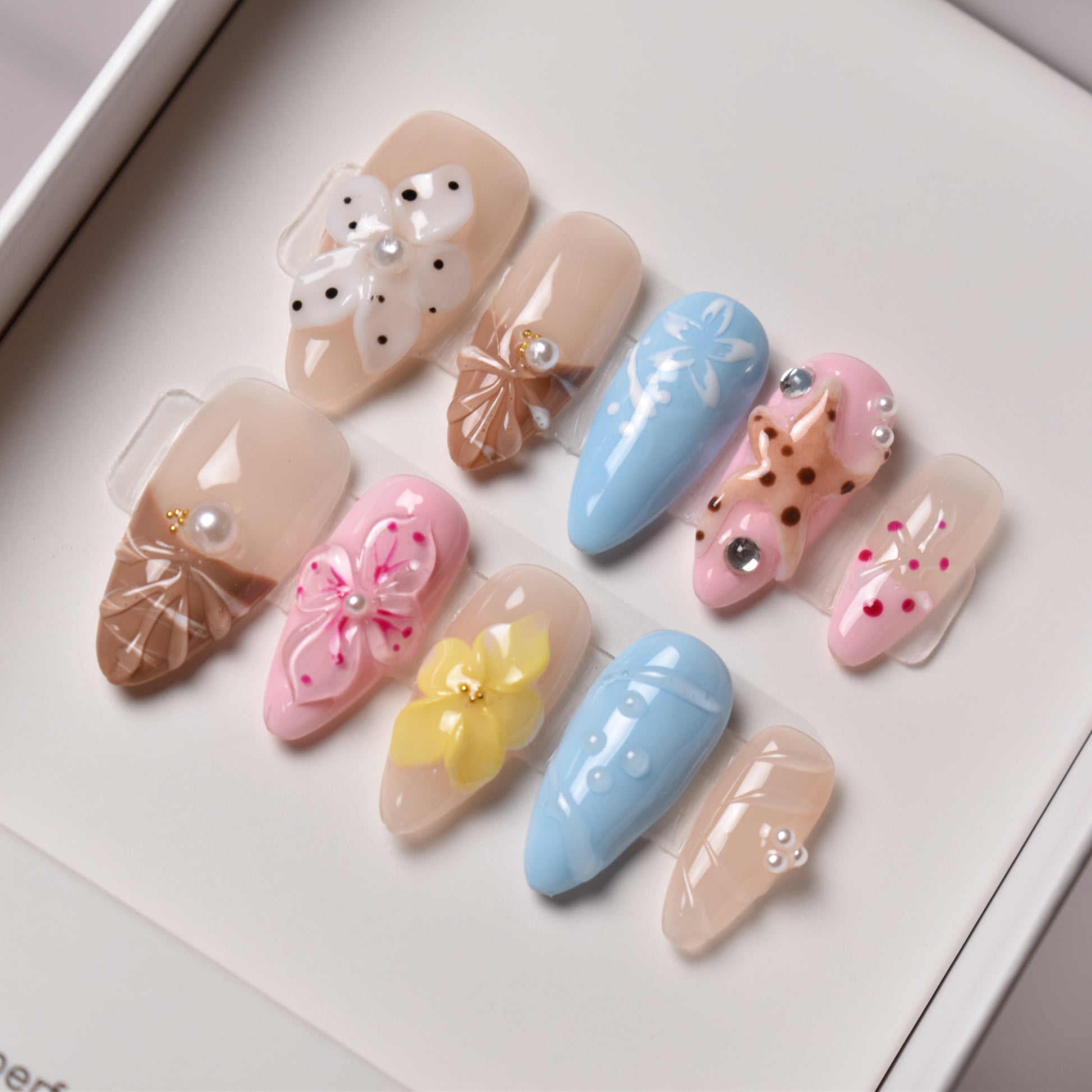 A playful festival unfolds across these pastel nails, where blue, pink, yellow, and cocoa hues meet candy-like pearls and sculpted blossoms. Each detail sparkles with the joy of sunlit fairgrounds, the sweetness of shared treats, and the carefree laughter of summer afternoons.
