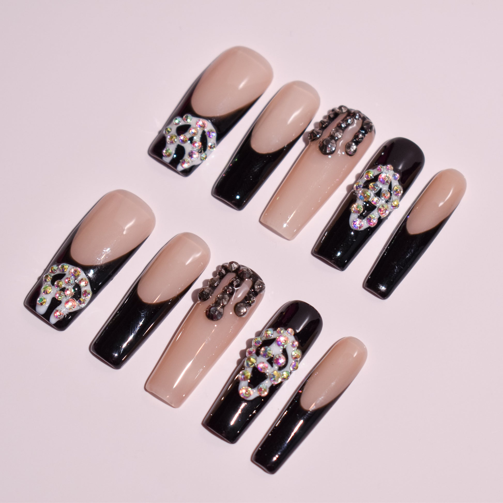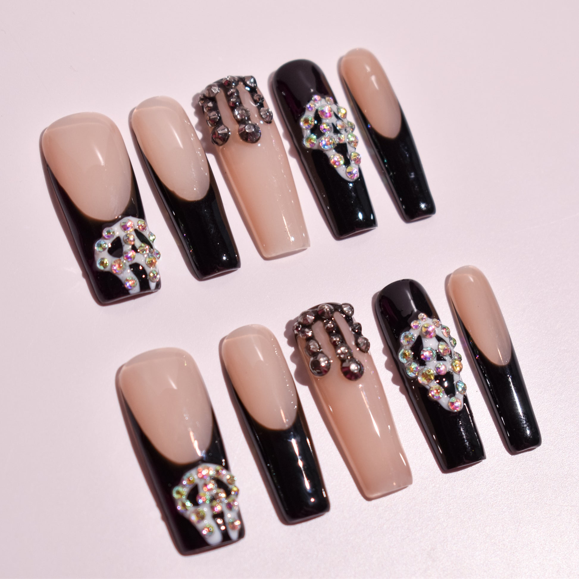 Noir Crystal Drip is a long coffin press-on nail set that fuses sleek nude tones with jet-black contrast and high-shine crystal embellishments. Designed for bold minimalists, this set features sculpted rhinestone drips, crystal skull accents, and glossy black panels that create a luxe, dark-glam aesthetic.