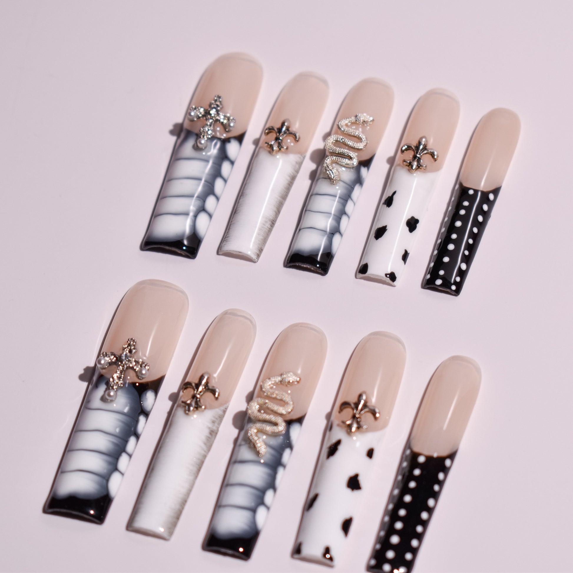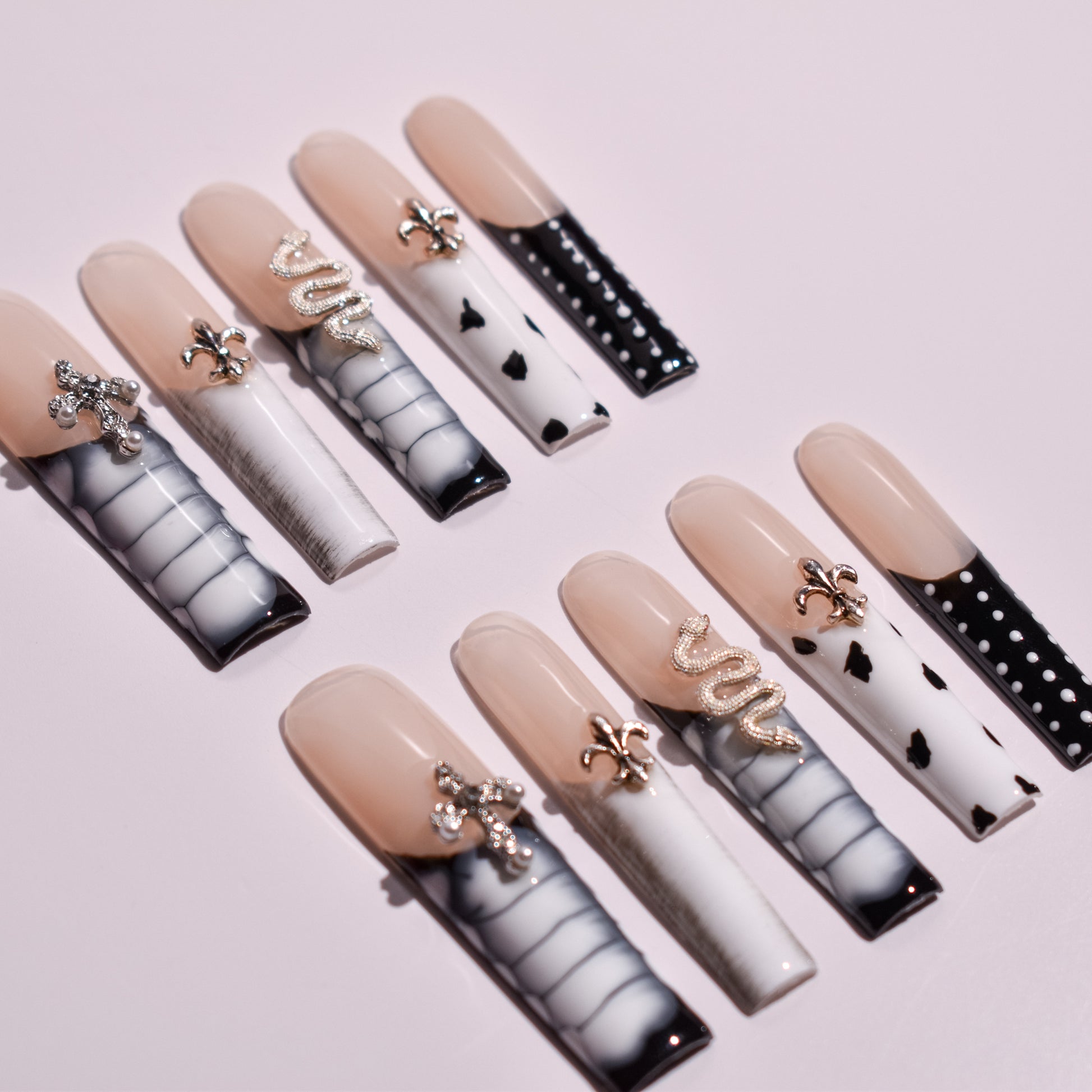 Exude an air of calculated elegance with this avant-garde press-on set, a masterclass in monochrome maximalism. Designed for the discerning individual, these nails feature a dramatic extra-long coffin shape that provides a sprawling canvas for a symphony of textures and patterns. The color story is strictly sophisticated, utilizing a stark contrast of obsidian black and crisp alabaster white over a translucent, high-gloss nude base for a contemporary, clean-lined finish.