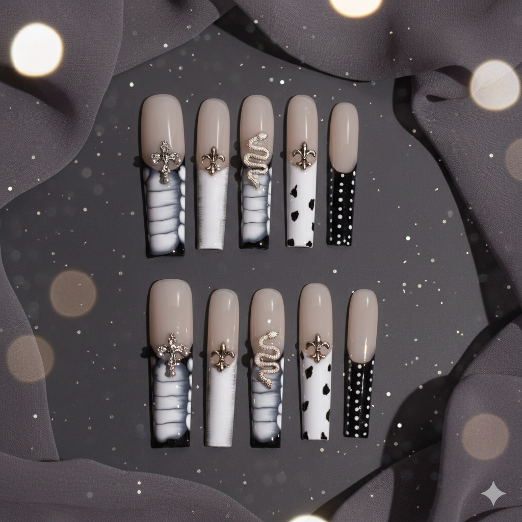 Elevation is achieved through a curated selection of opulent 3D silver-toned hardware. Sculpted gel techniques secure a series of heavy-metal embellishments, including ornate gothic crosses, regal fleur-de-lis charms, and a shimmering, textured snake that winds across the nail bed. These tactile accents create a captivating play of light and shadow, transforming your manicure into a piece of high-fashion jewelry. This set is not merely an accessory; it is a definitive statement of power and prestige.