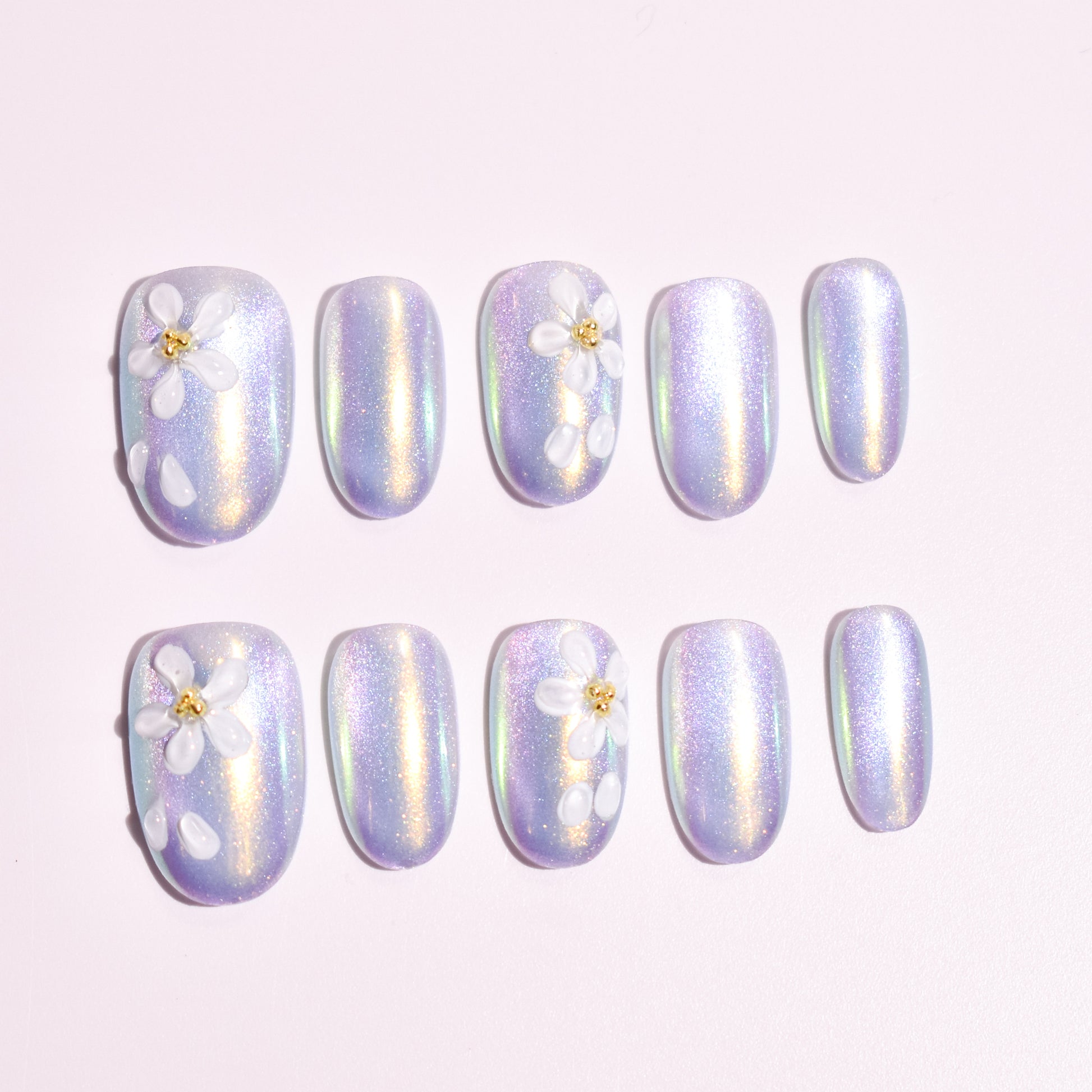 Select nails are adorned with hand-sculpted 3D white flowers, each finished with a delicate gold bead center, adding dimension and a romantic focal point. Minimal petal accents balance the set, allowing the iridescent surface to remain the star.