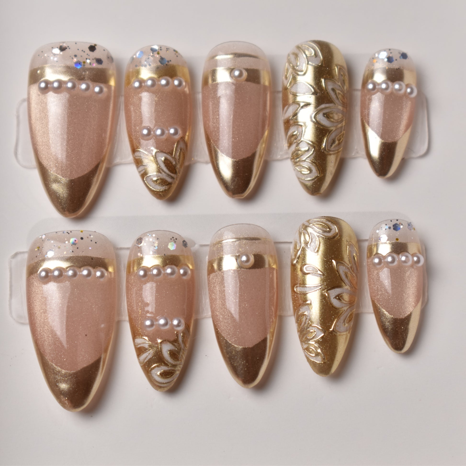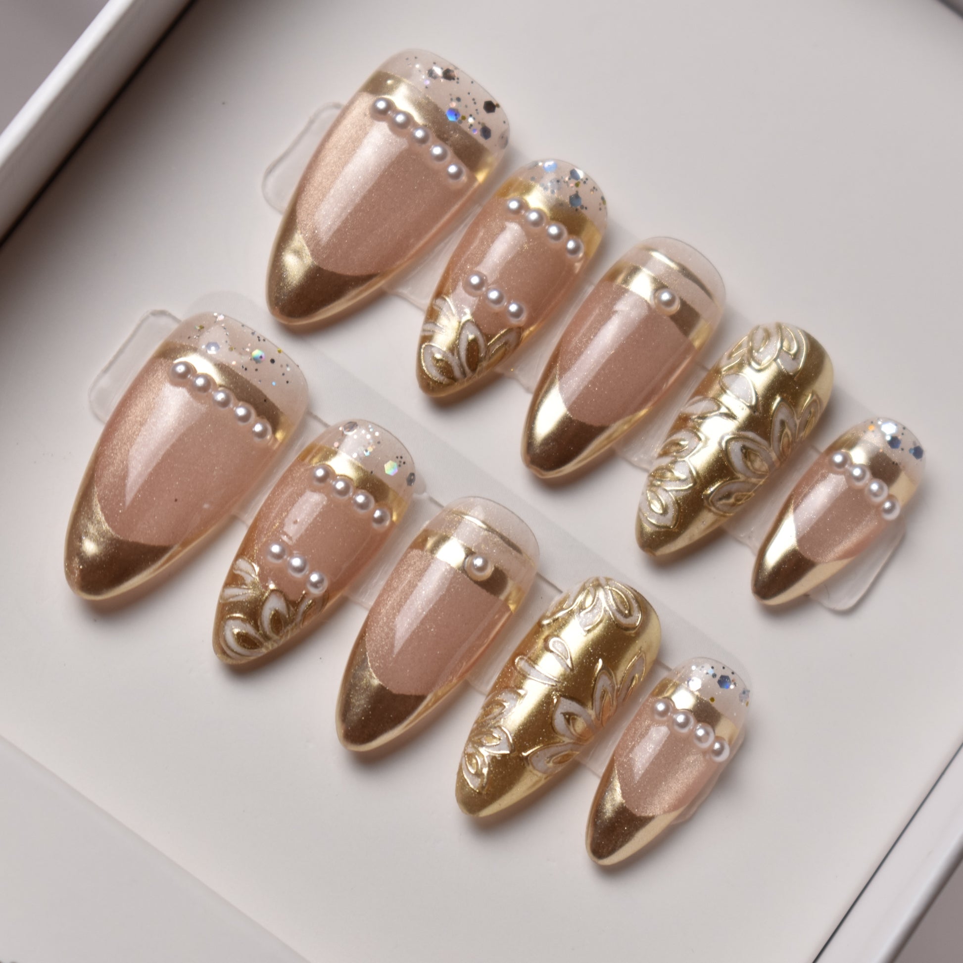 Luxe gold tips grace a nude base, adorned with pearl accents and intricate gilded scrolls. The balance of minimal elegance and ornate detail recalls treasures from a royal garden. Perfect for formal banquets and timeless style lovers.