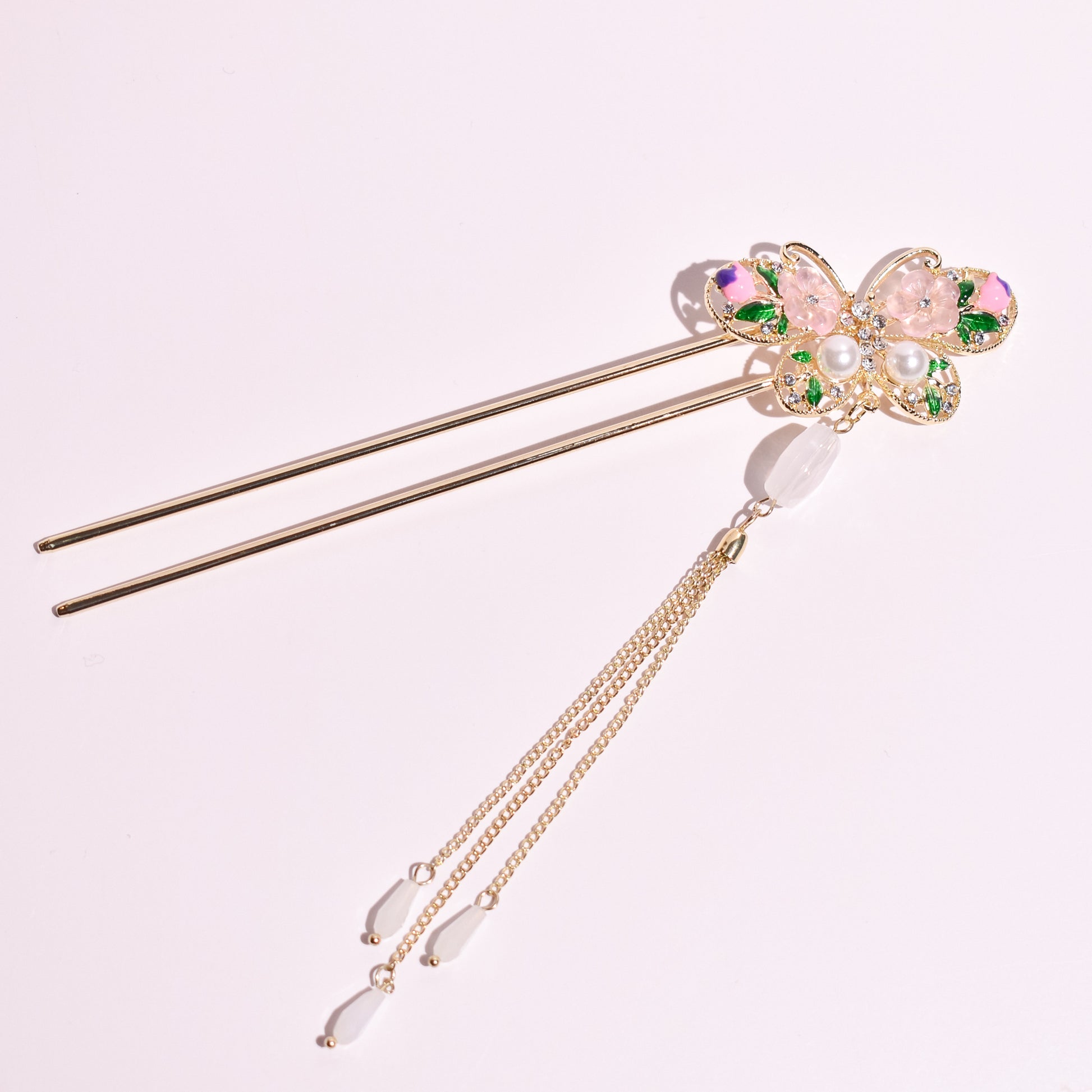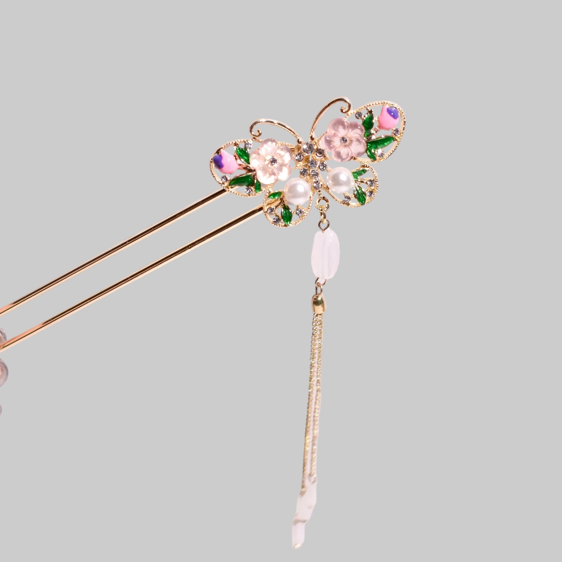 Like a celestial visitor pausing upon a garden bloom, this hairpin captures the fluttering grace of a butterfly in mid-flight. Its gilded wings, adorned with soft pink blossoms and verdant leaves, whisper stories of eternal spring and the delicate balance of nature's most beautiful transformations.
