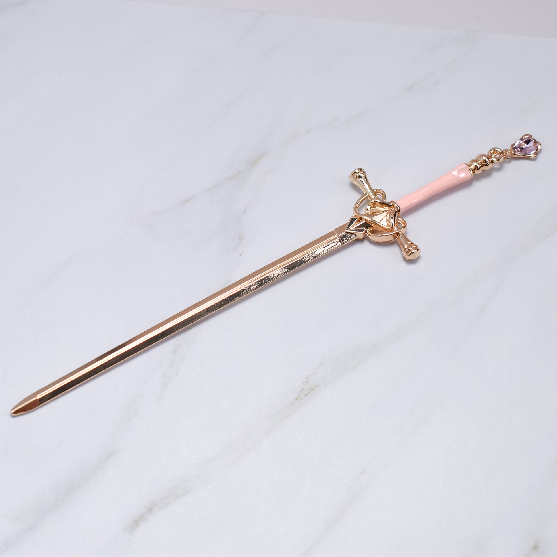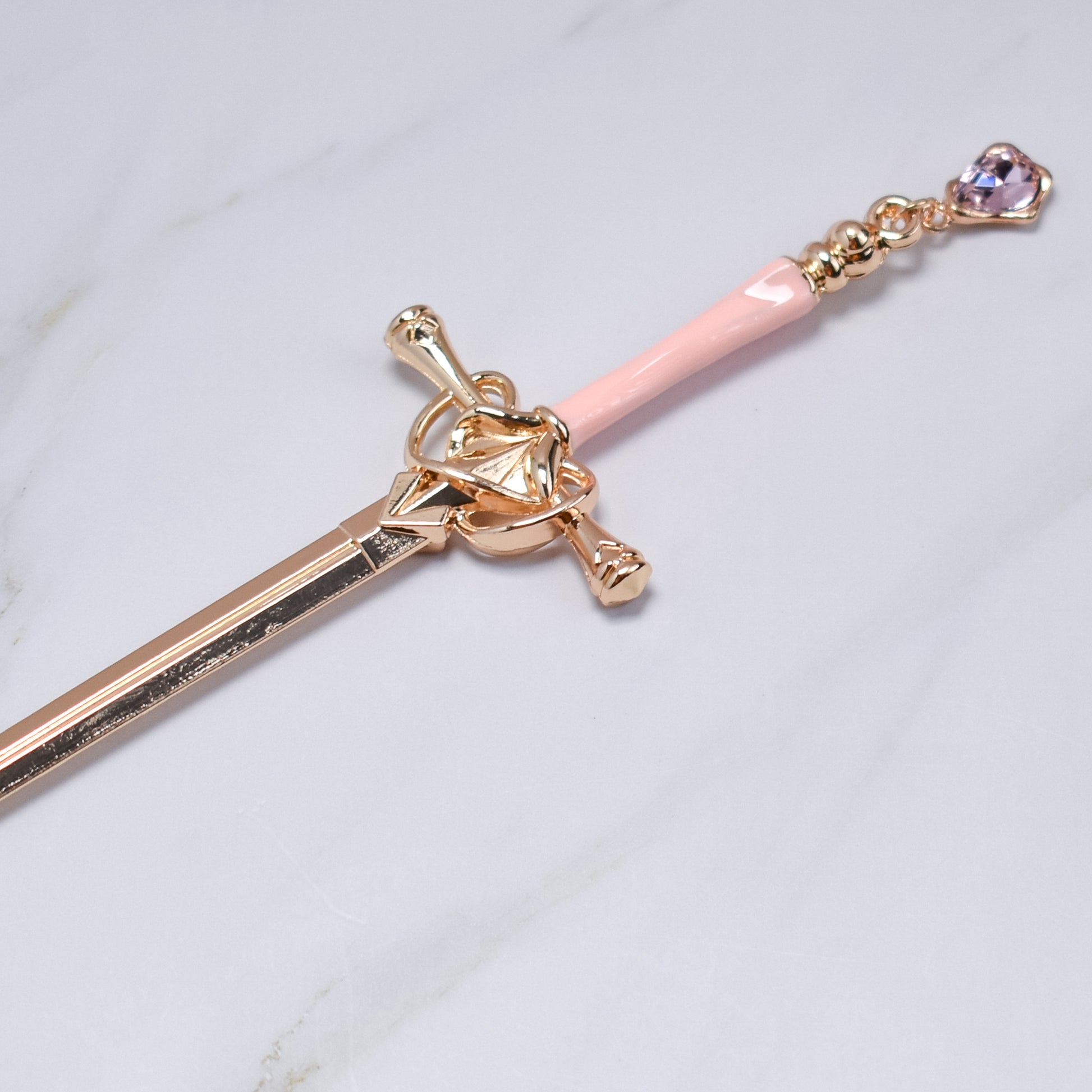 Each hairpin features a beautifully polished rose-gold sword silhouette with a smooth enamel handle in gentle pastel tones. At the end of the hilt, a sparkling faceted gemstone heart creates a magical shimmering accent that catches the light beautifully.