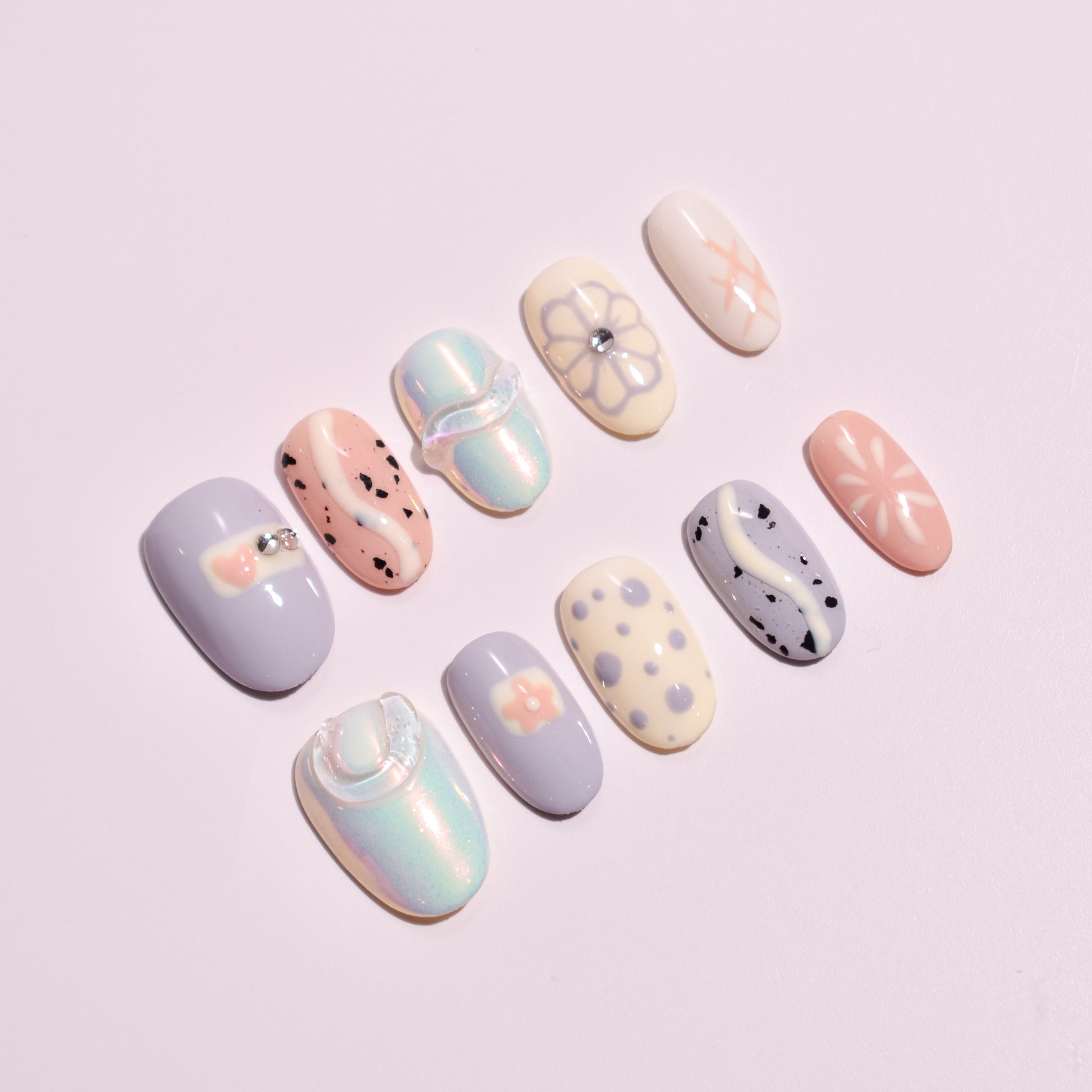 Pastel Ripple Garden is a playful yet elevated medium oval press-on nail set inspired by soft spring colors, abstract art, and dreamy textures. This set mixes pastel lavender, peach, butter yellow, and iridescent mint into a cohesive, artsy composition that feels light, modern, and fun.