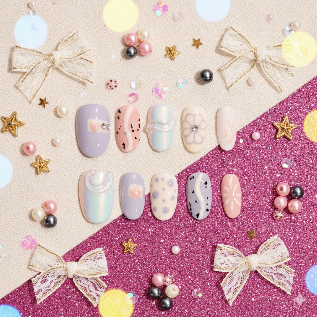 Each nail features a unique design — from 3D gel ripple accents and glossy wave details to hand-painted florals, speckled textures, and soft polka dots. The combination creates a curated “gallery wall” effect where every nail feels different, yet harmonious. Subtle crystal accents add just enough sparkle without overpowering the pastel palette.