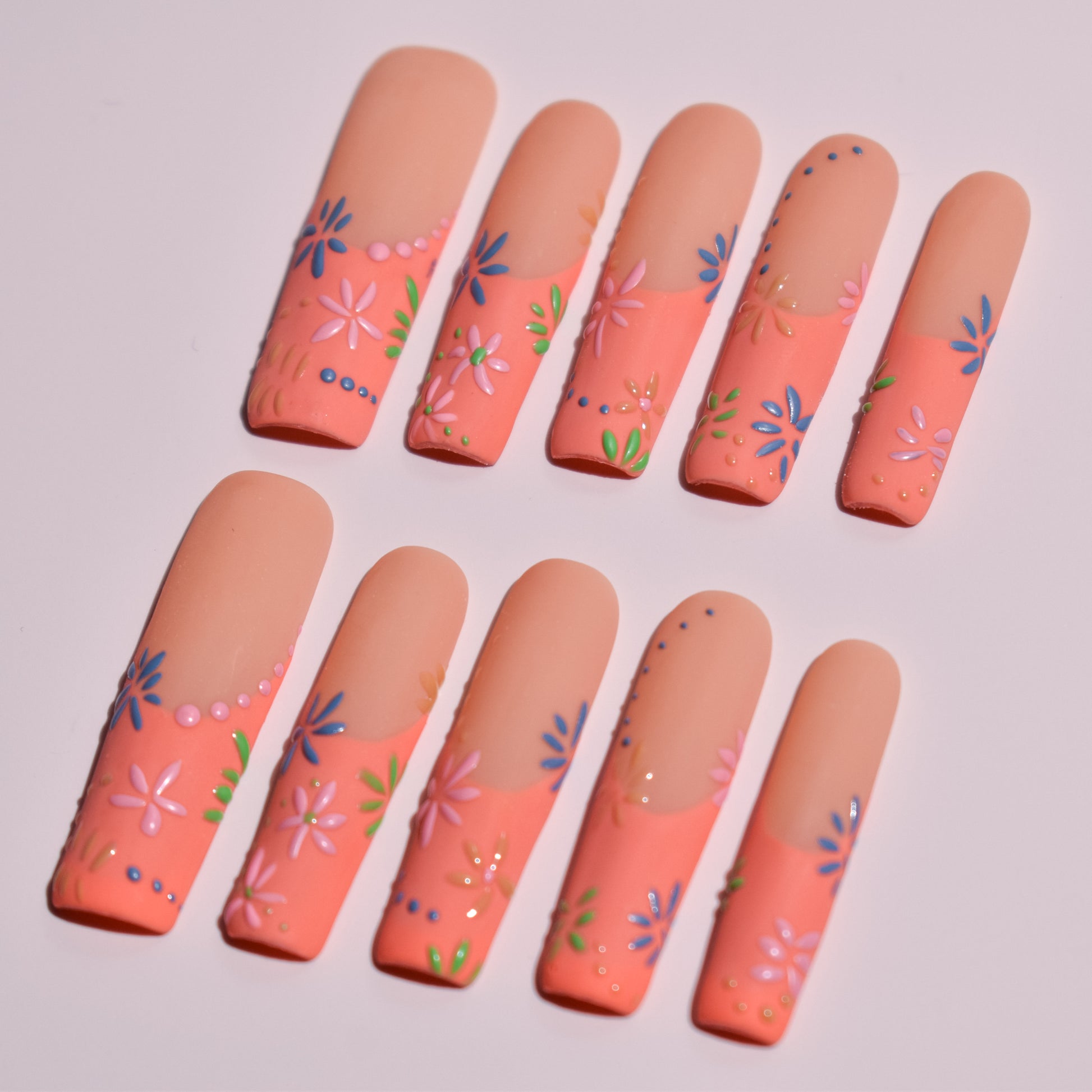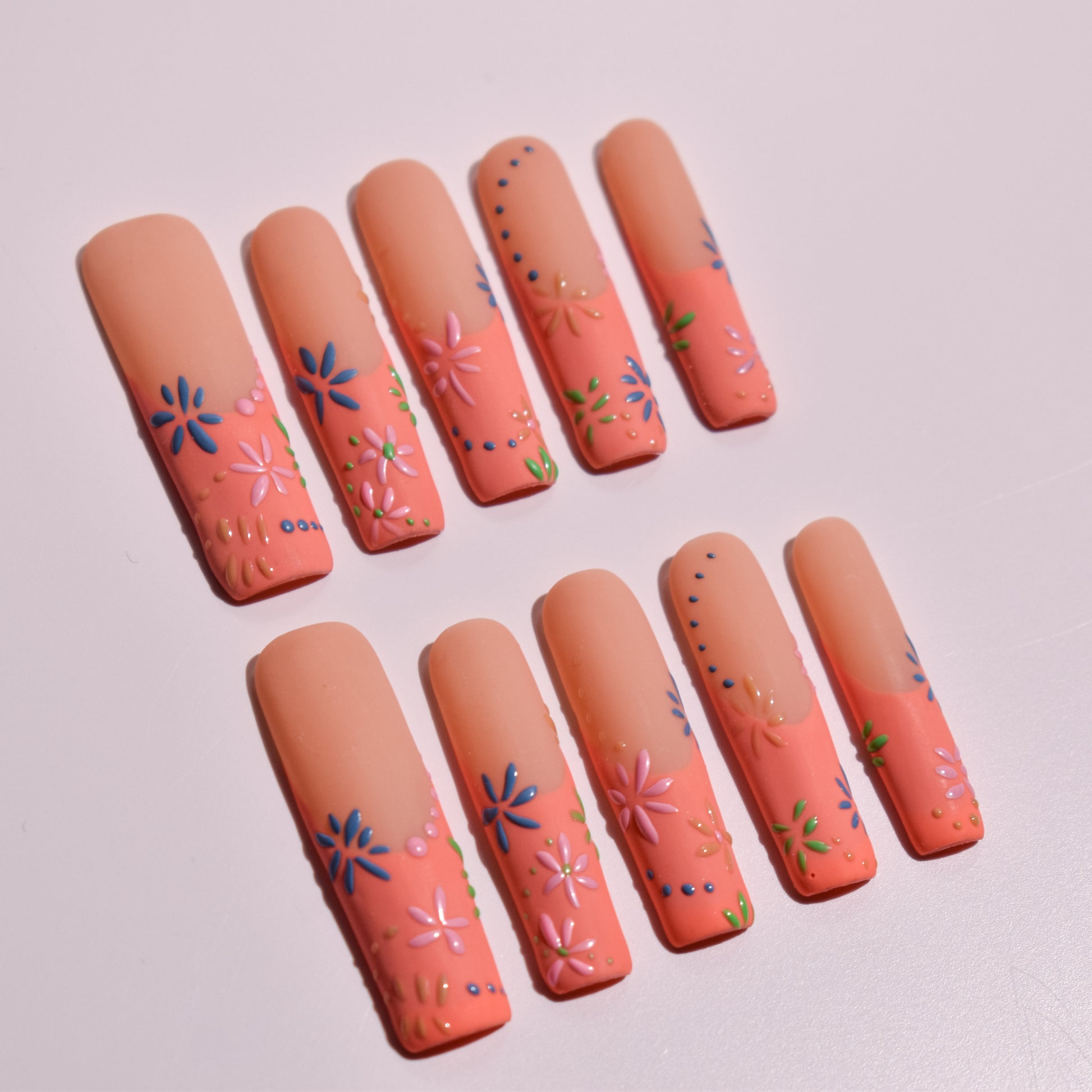 This collection of Handmade Press-on Nails offers a soft, contemporary take on Custom Japanese Nail Art, focusing on a delicate and organic aesthetic. The design features a sophisticated matte finish that enhances the velvety appearance of the peach and apricot color scheme. Sculpted into a Long Square silhouette, the nails use a subtle nude-to-peach gradient that provides a modern, seamless foundation for the intricate hand-painted details.