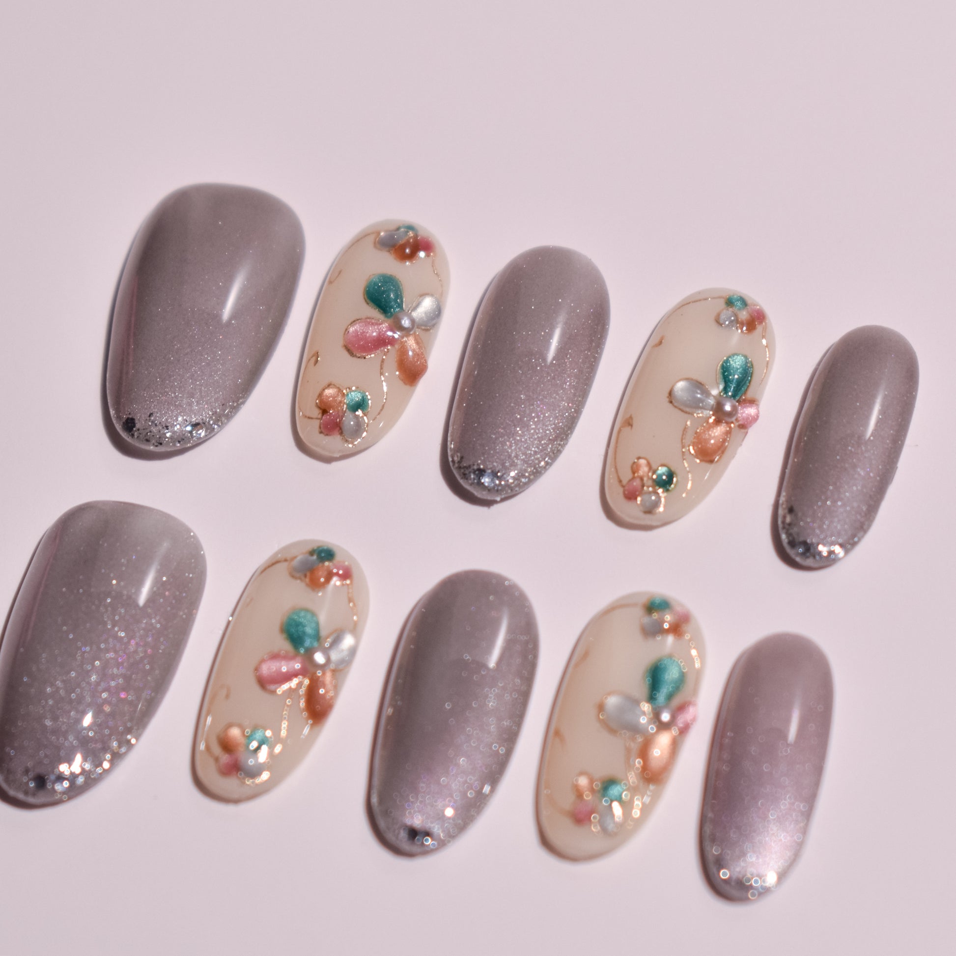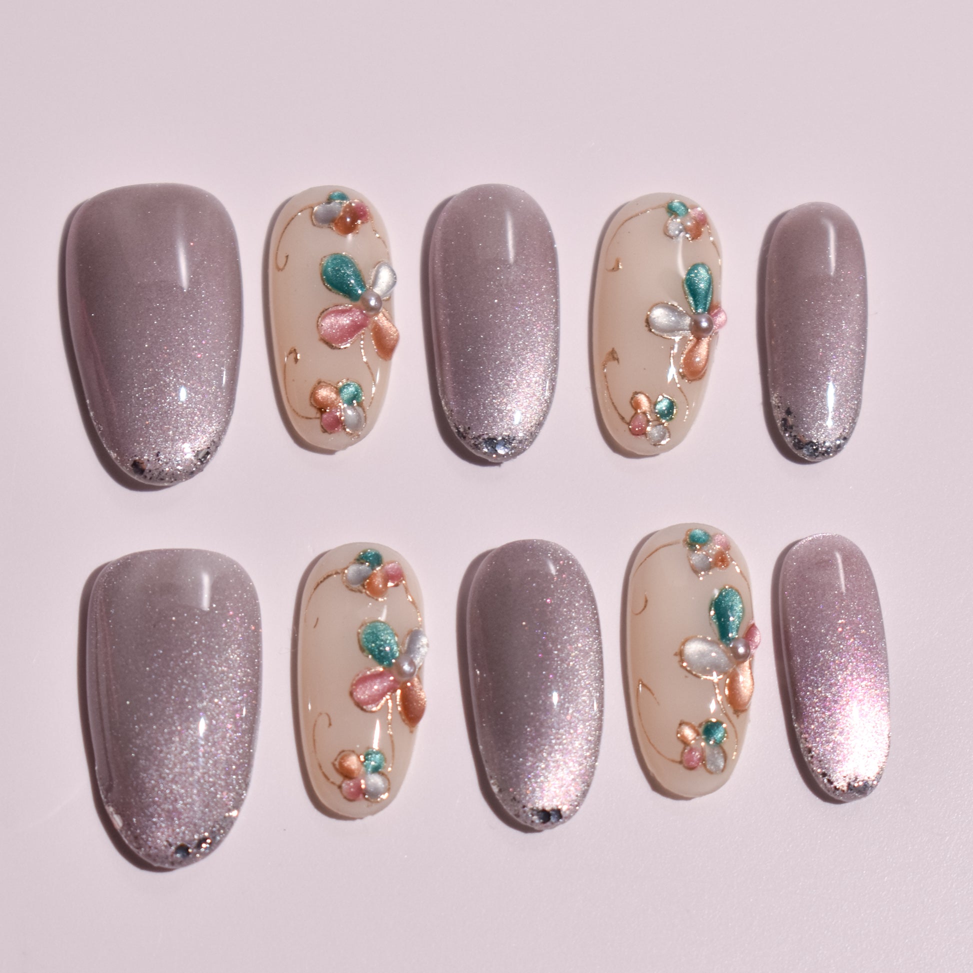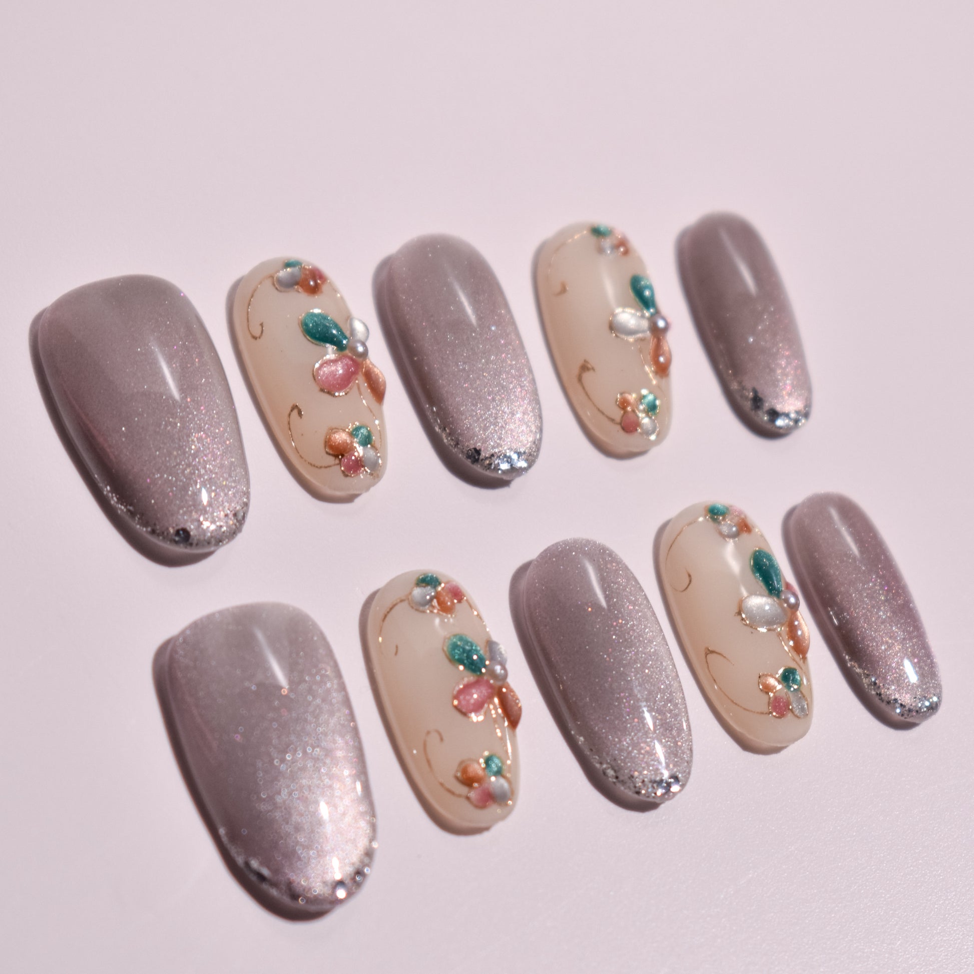 Select nails feature hand-painted floral motifs built petal by petal using dimensional gel, combining muted jewel tones of teal, blush, champagne, and pearl. Fine gold linework flows organically between flowers, adding movement and a couture-level finish. The shimmer nails are layered with micro-reflective pigment that catches light effortlessly, with subtle depth created through gradient application and controlled saturation.