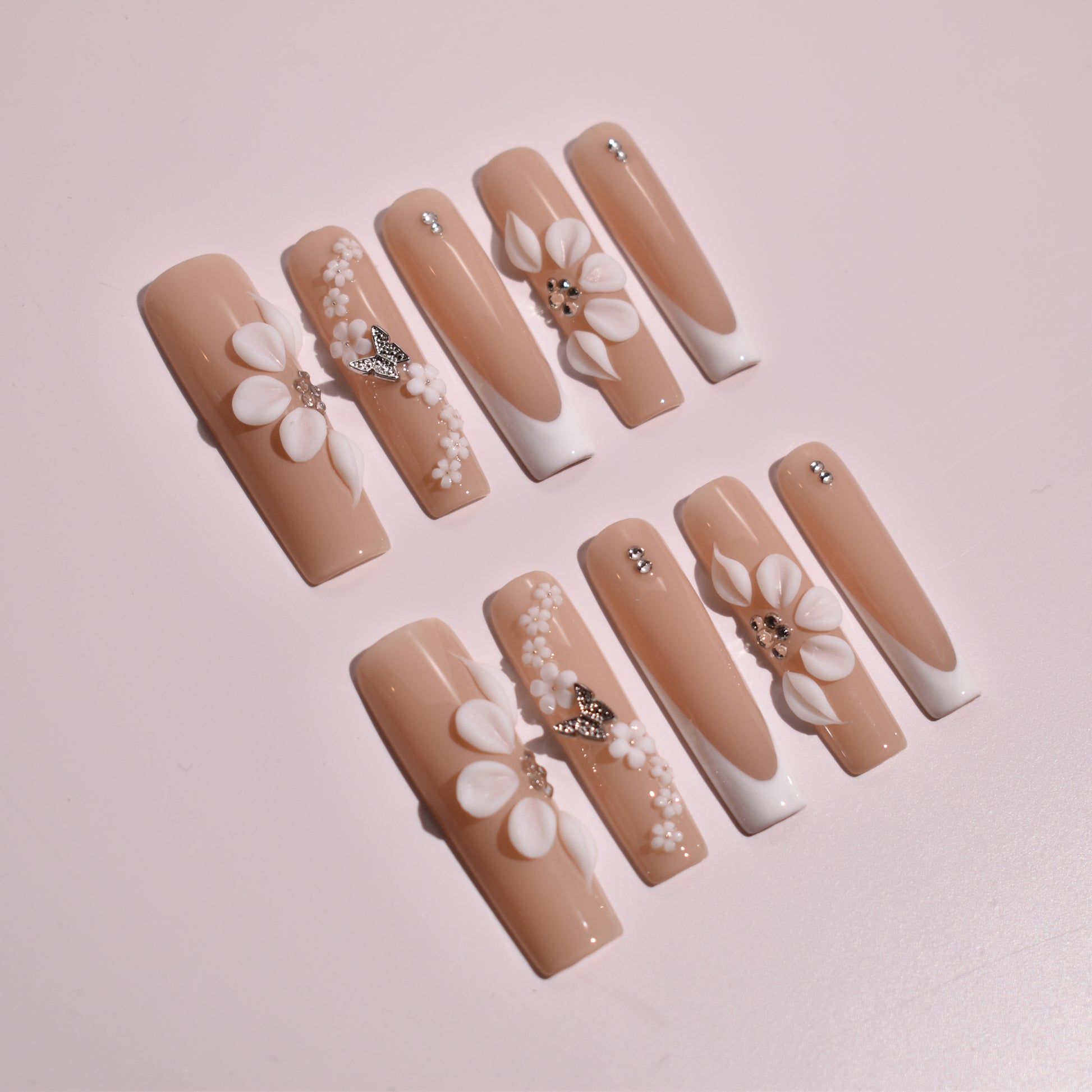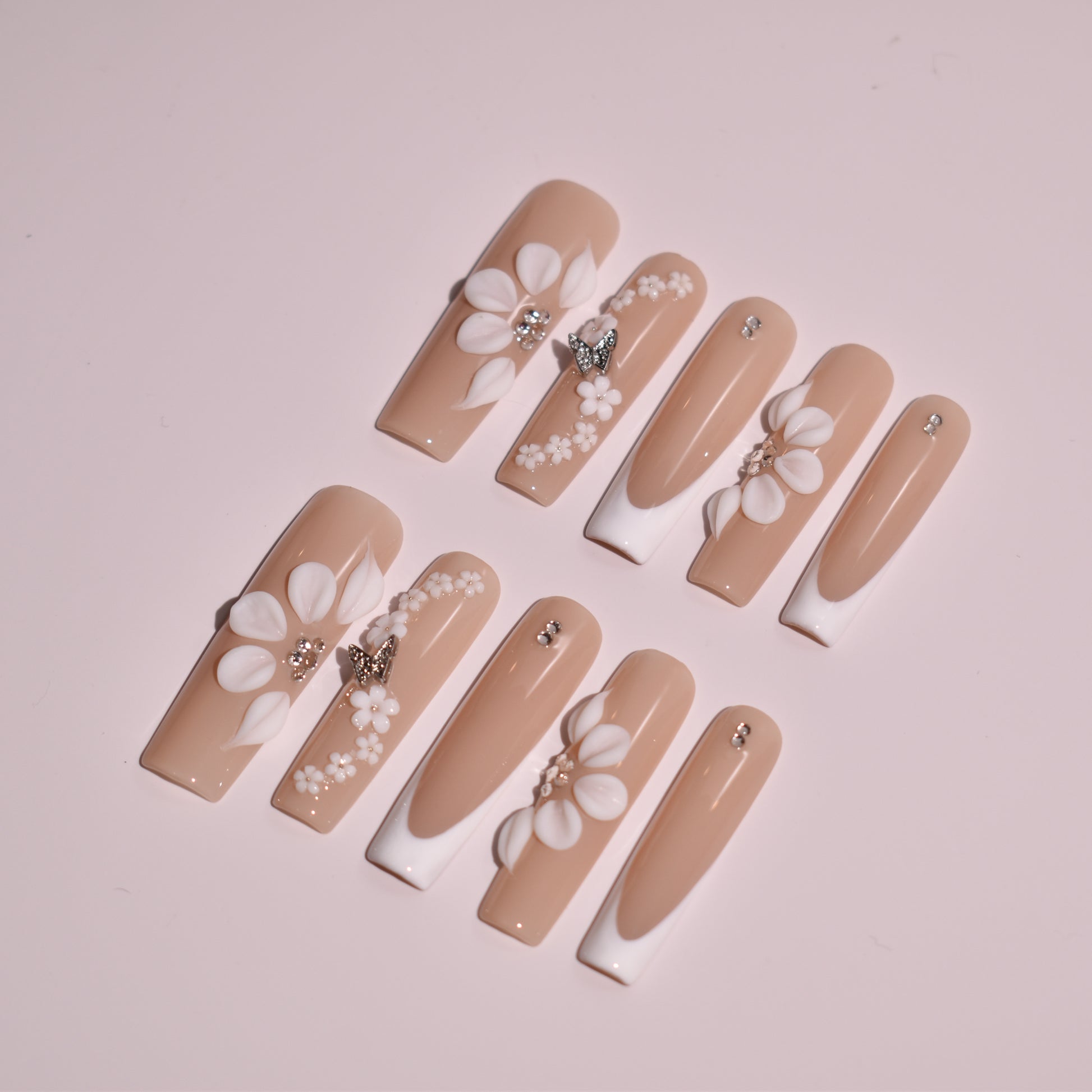 The design is brought to life through hand-sculpted 3D floral elements, with layered gel petals arranged in delicate clusters for a couture, dimensional effect. Select accent nails showcase cascading floral details paired with micro crystal accents and metallic butterfly charms, while others remain sleek with minimal rhinestone placements for balance. Each floral and embellishment detail is individually applied by hand, creating texture, depth, and an artisanal finish that feels romantic yet modern.