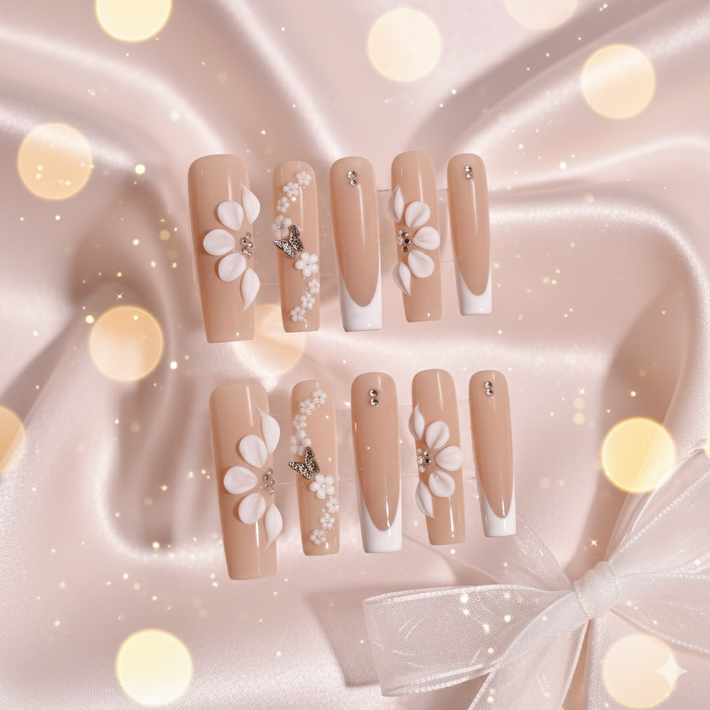 Petal Veil Elegance is a refined handmade press-on nail set crafted in a long square silhouette, offering a bold yet graceful profile that elongates the hands with polished structure. The base features a warm nude beige tone, complemented by clean soft-white French tips that add contrast while maintaining a timeless, elevated aesthetic.
