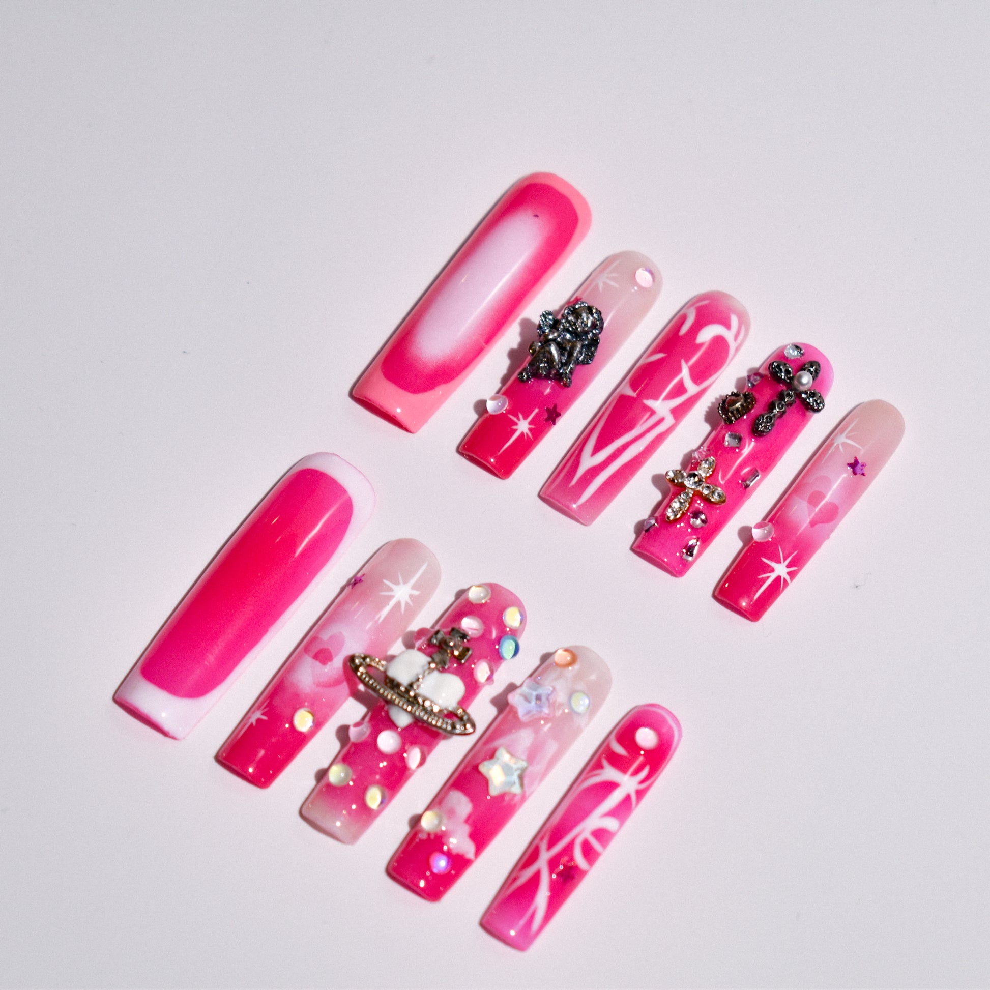 Turn all eyes your way with Pink Halo XL, an extra-long square press-on nail set made for full glam moments. This design features layered shades of hot pink, soft blush, and milky nude, blended in smooth ombré fades and graphic line art for a bold yet polished finish. The high-gloss base is elevated with 3D silver and crystal charms, including crosses, stars, hearts, pearls, and statement centerpiece accents that add dimension and sparkle from every angle.