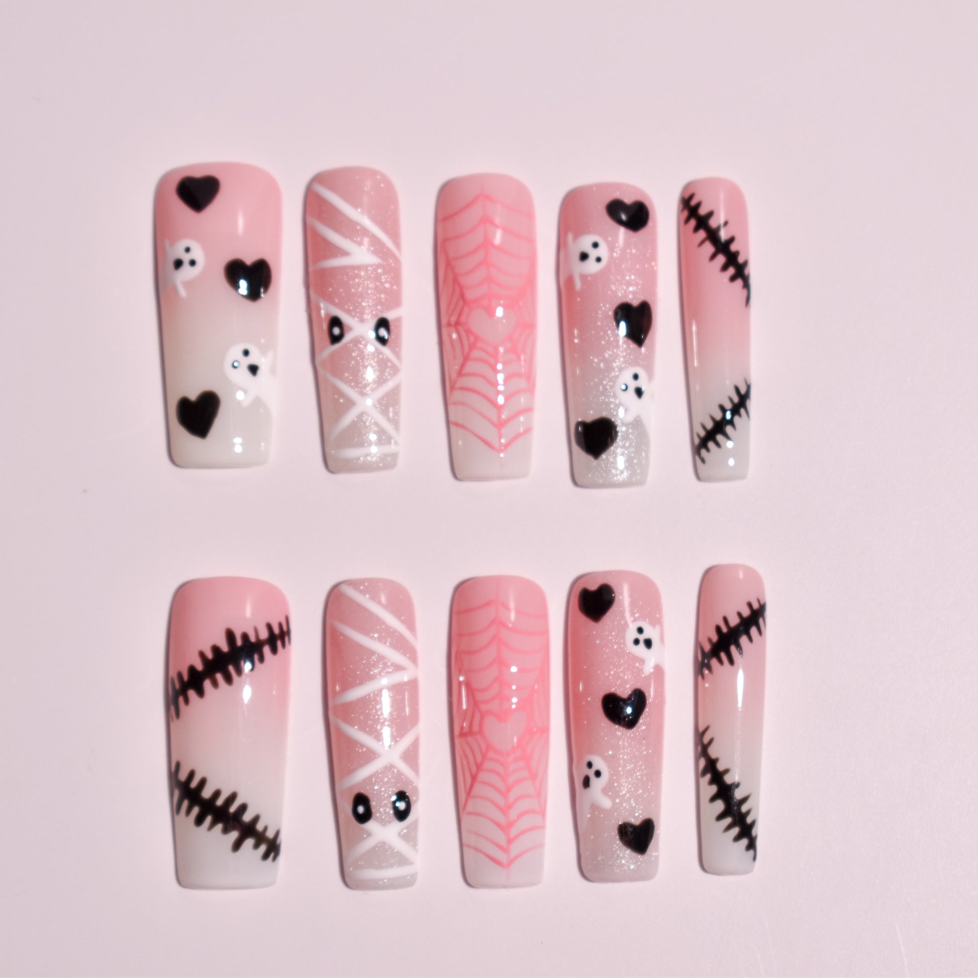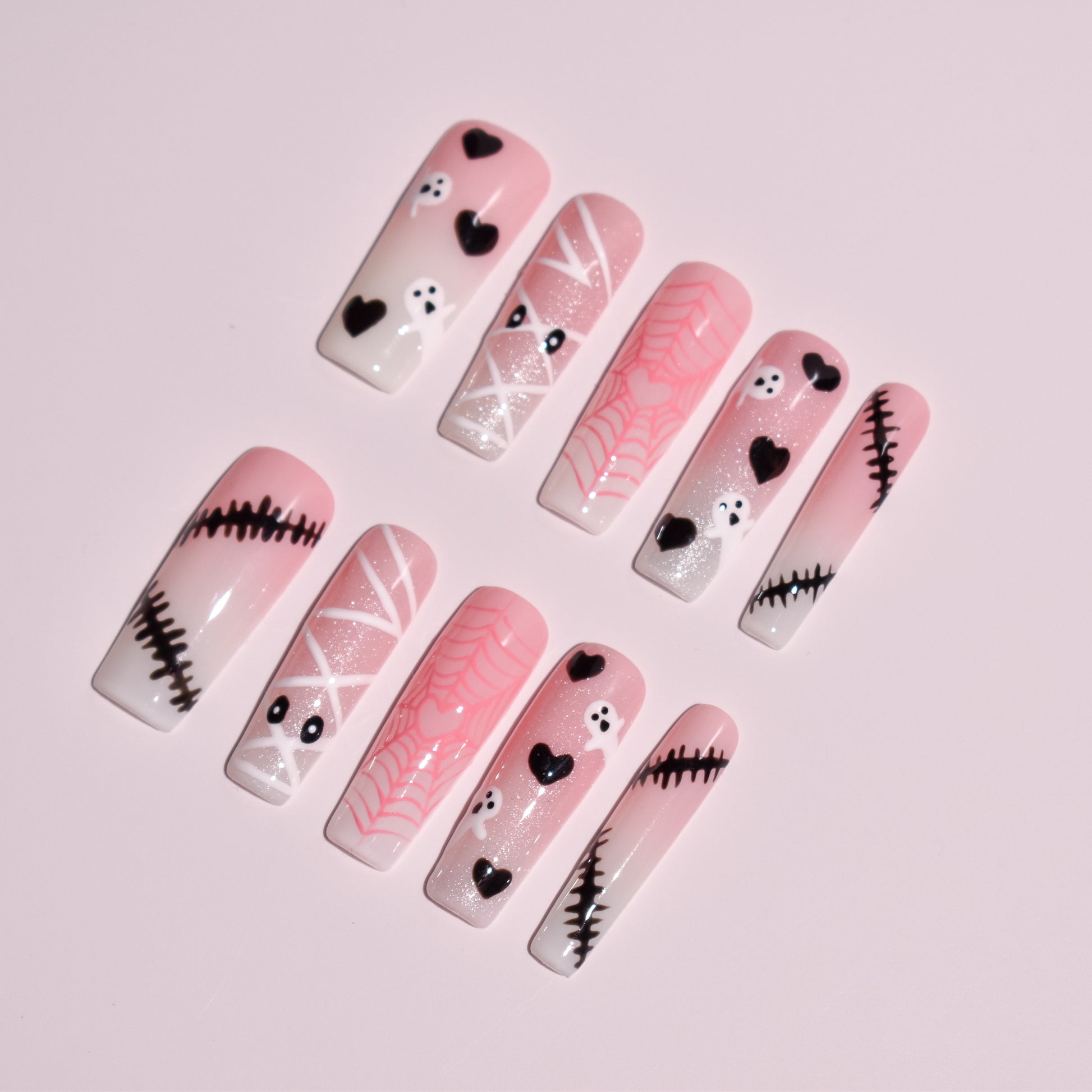 Pink Phantom Sweetheart is a long square press-on nail set that blends soft pink gradients with playful spooky details—tiny ghosts, black hearts, stitched accents, mummy wraps, and delicate spiderwebs.