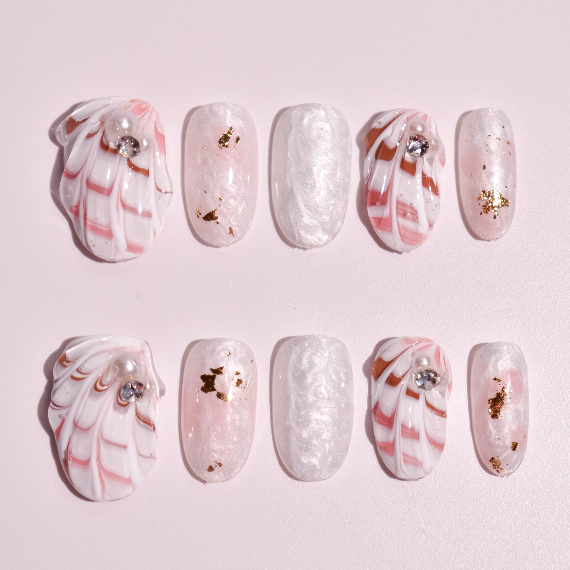 Design: Milky marble swirls, blush accents, gold foil flakes, pearl & crystal details