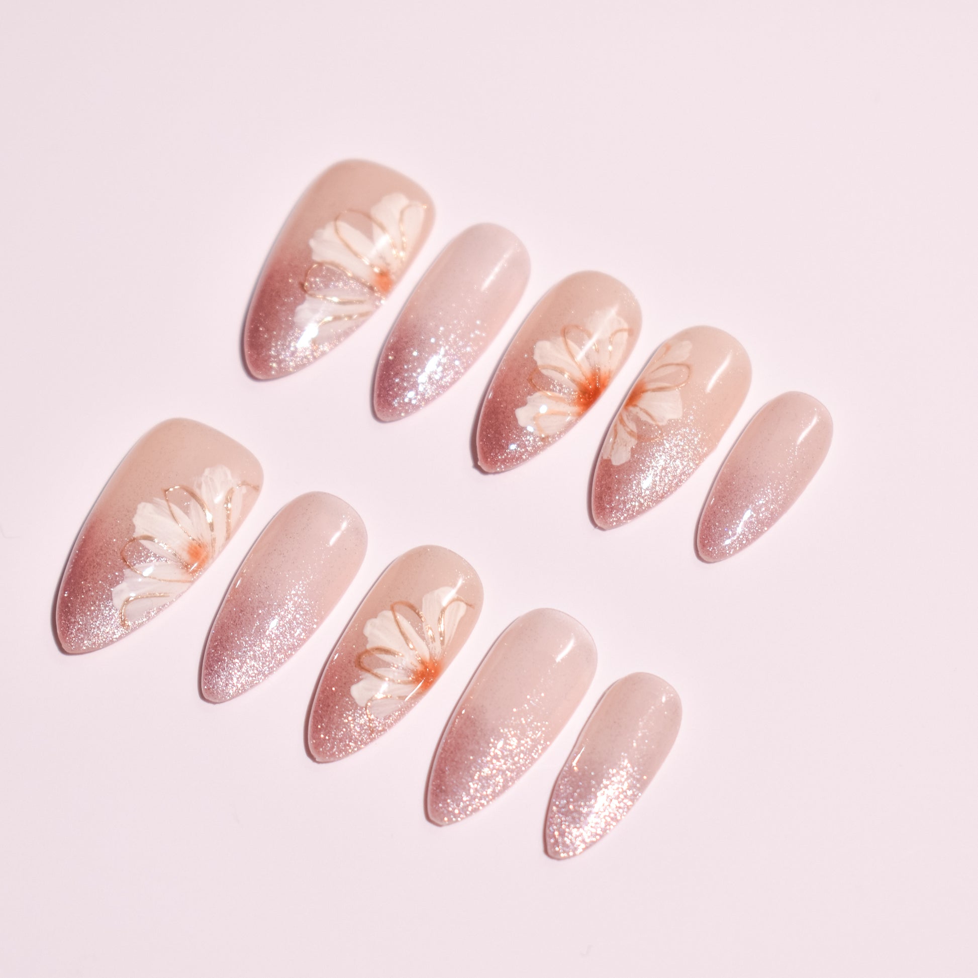 This design features a nude blush base that melts seamlessly into a rose-gold glitter ombré, creating a luminous, airy gradient. Hand-painted white floral petals bloom gently across accent nails, outlined with fine metallic detailing for a subtle glow. The shimmer catches light beautifully without overpowering the softness of the design, giving it an ethereal, polished finish.