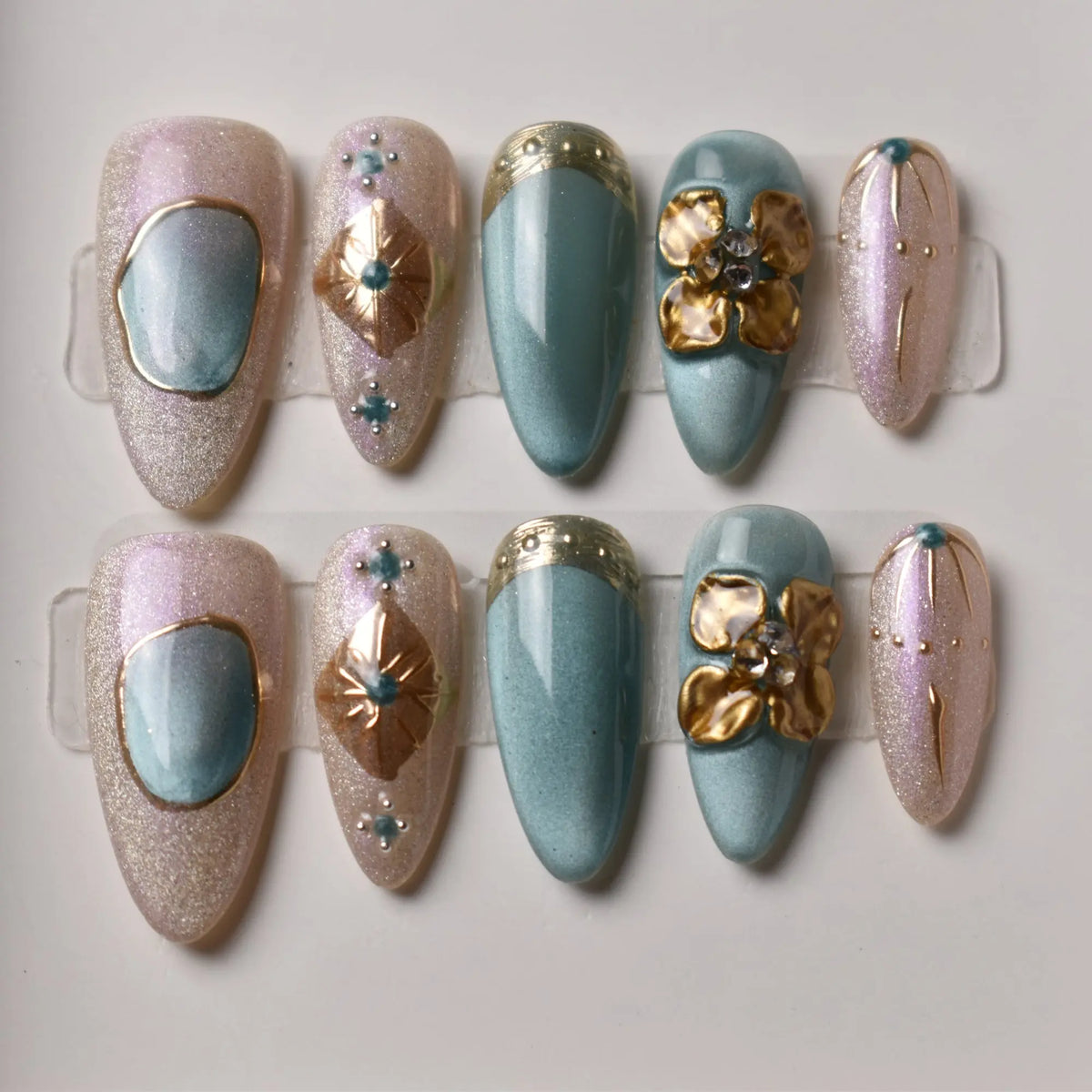 This luxurious set unites the serene depth of teal with the delicate radiance of blush champagne shimmer. Each nail is adorned with gold-embossed petals, luminous crystal accents, and opulent framing details, creating a regal composition. The interplay of soft sparkle and rich jewel tones evokes images of treasured heirlooms and royal banquets. Perfect for elegant evening galas, winter celebrations, and occasions that call for timeless sophistication.