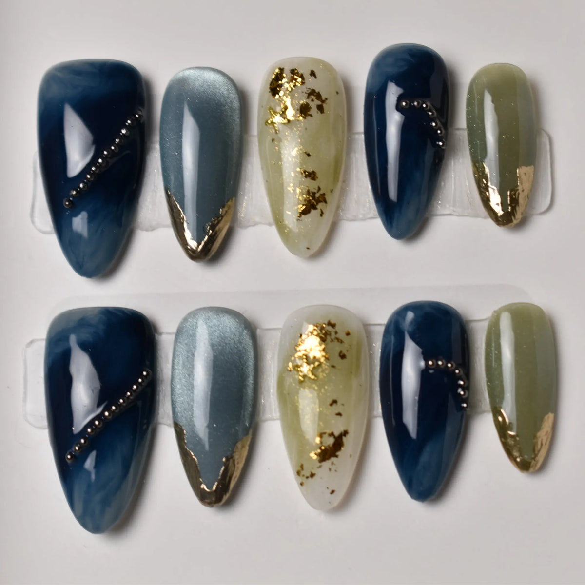 Gradient hues of emerald green and deep indigo meet shimmering blue, adorned with gleaming gold leaf and dainty bead accents. This luxurious set exudes sophistication, perfect for special occasions or refined nights out.