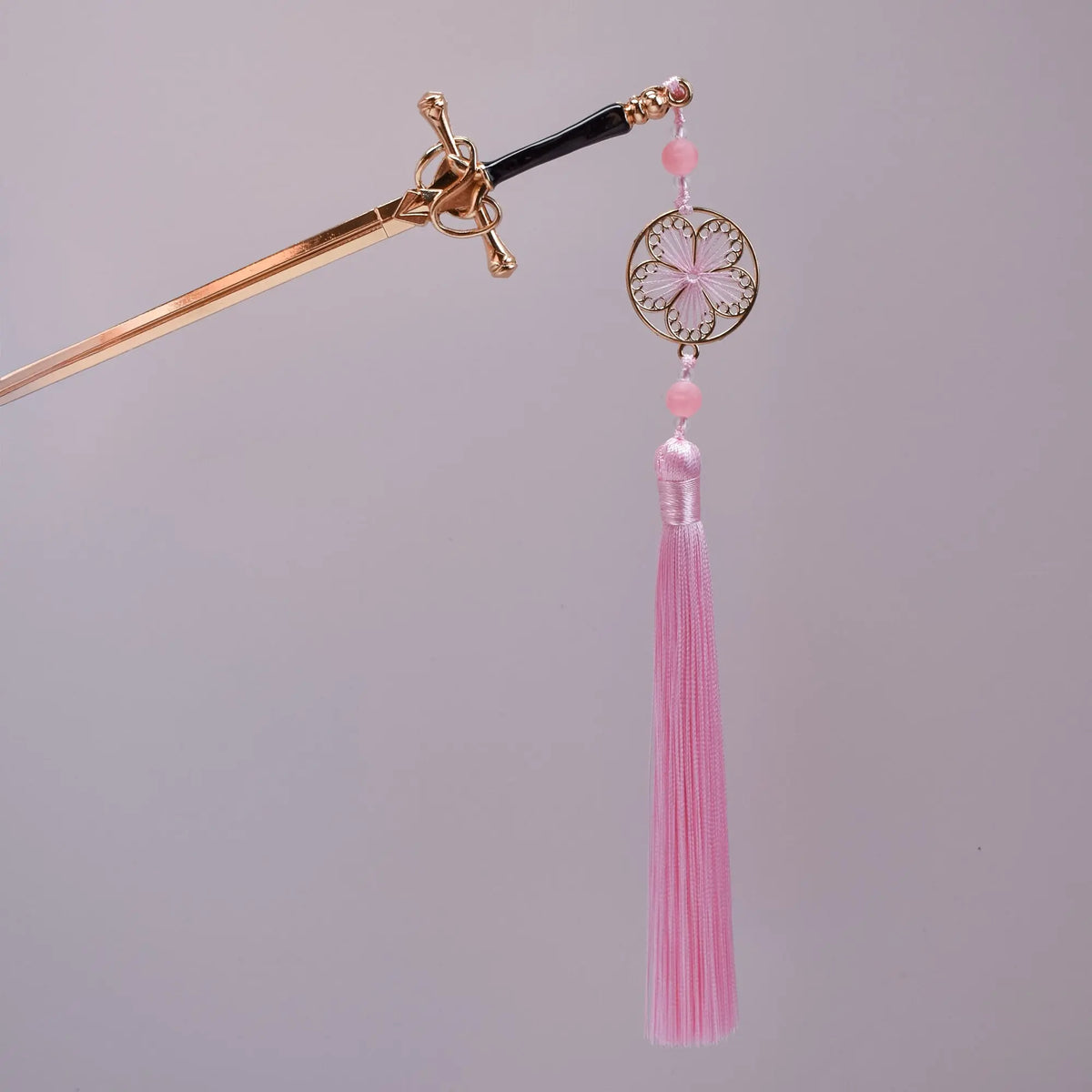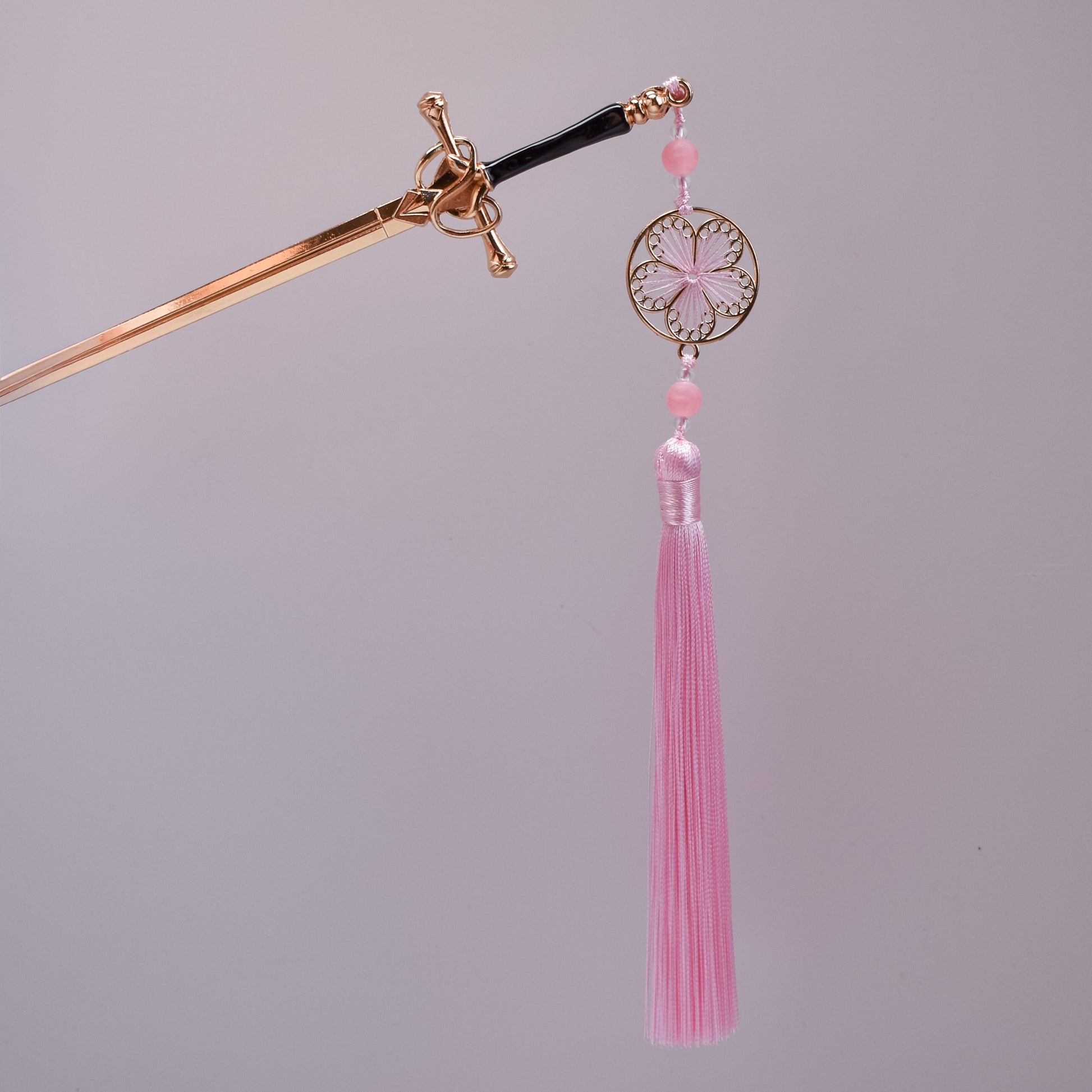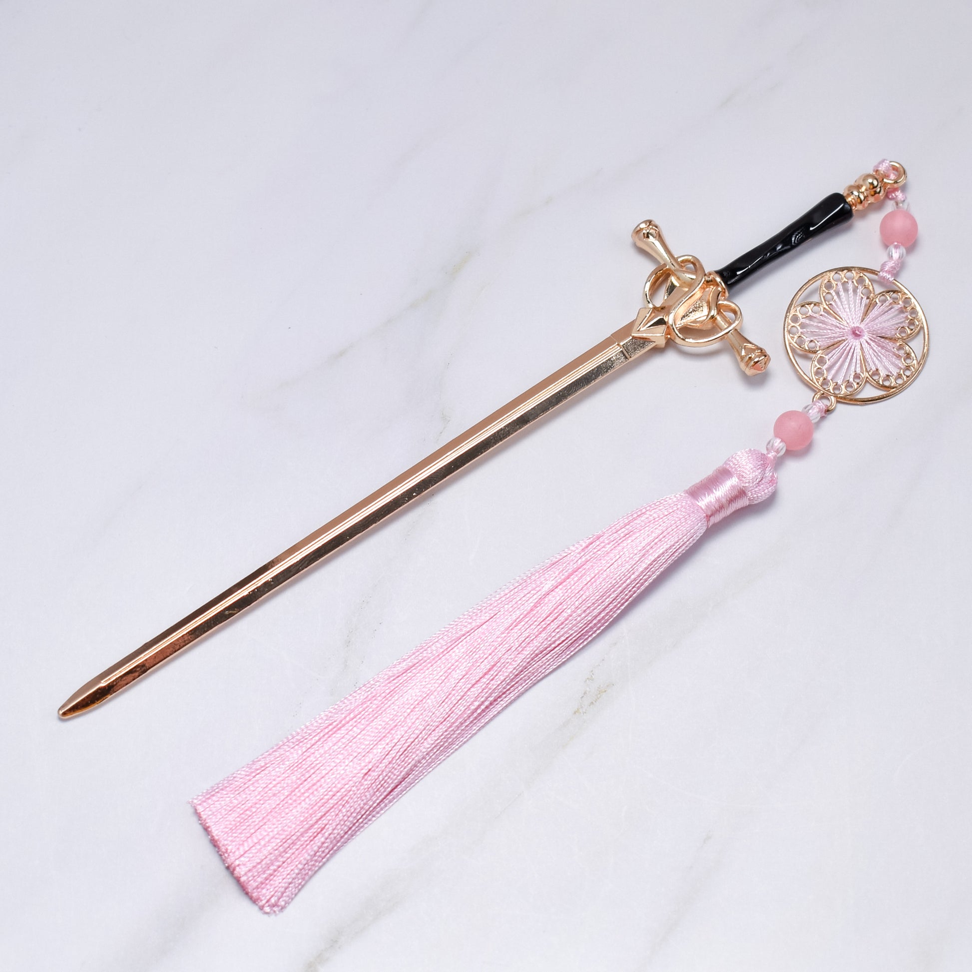 Sakura Blossom Sword Hairpin – Rose Gold & Pink Tassel