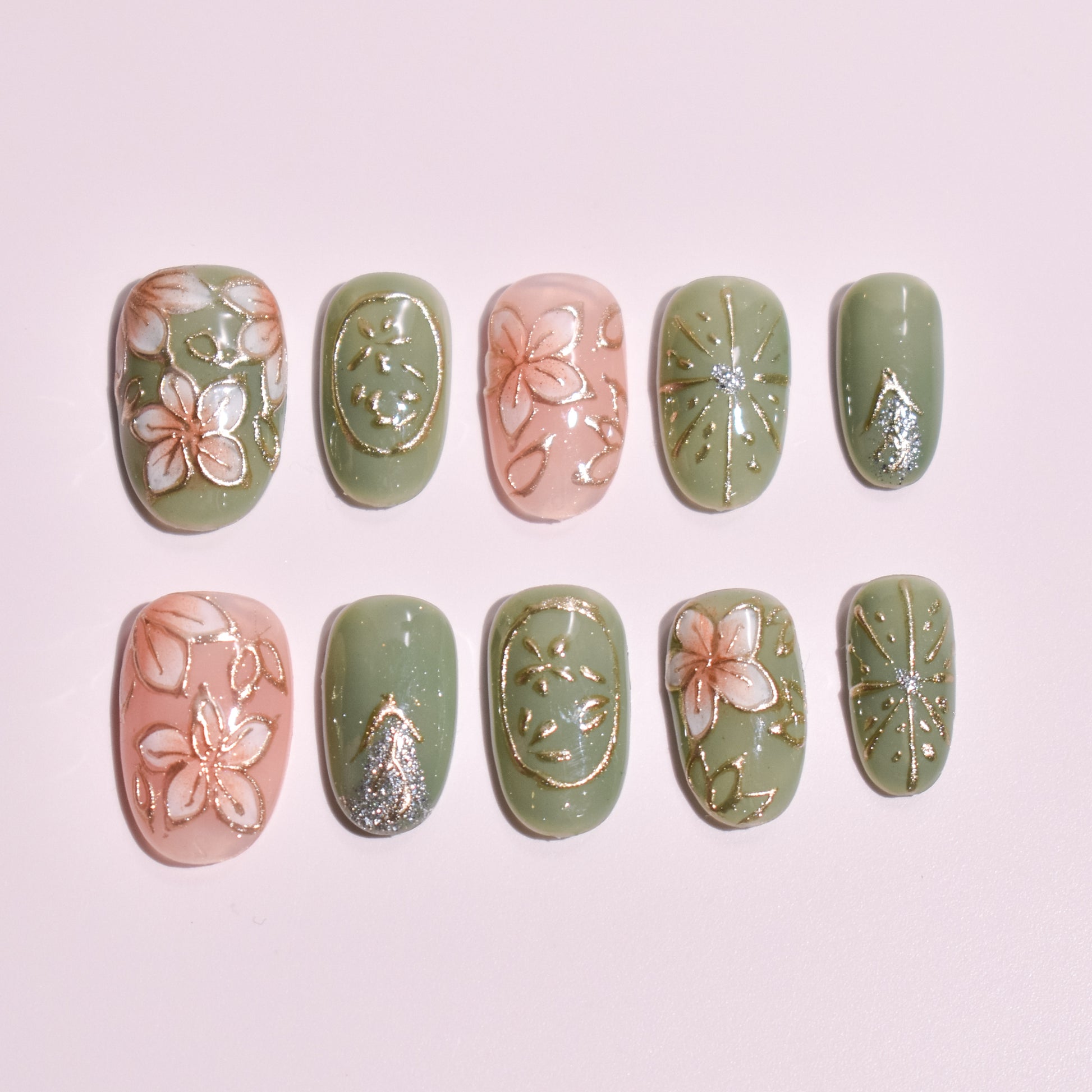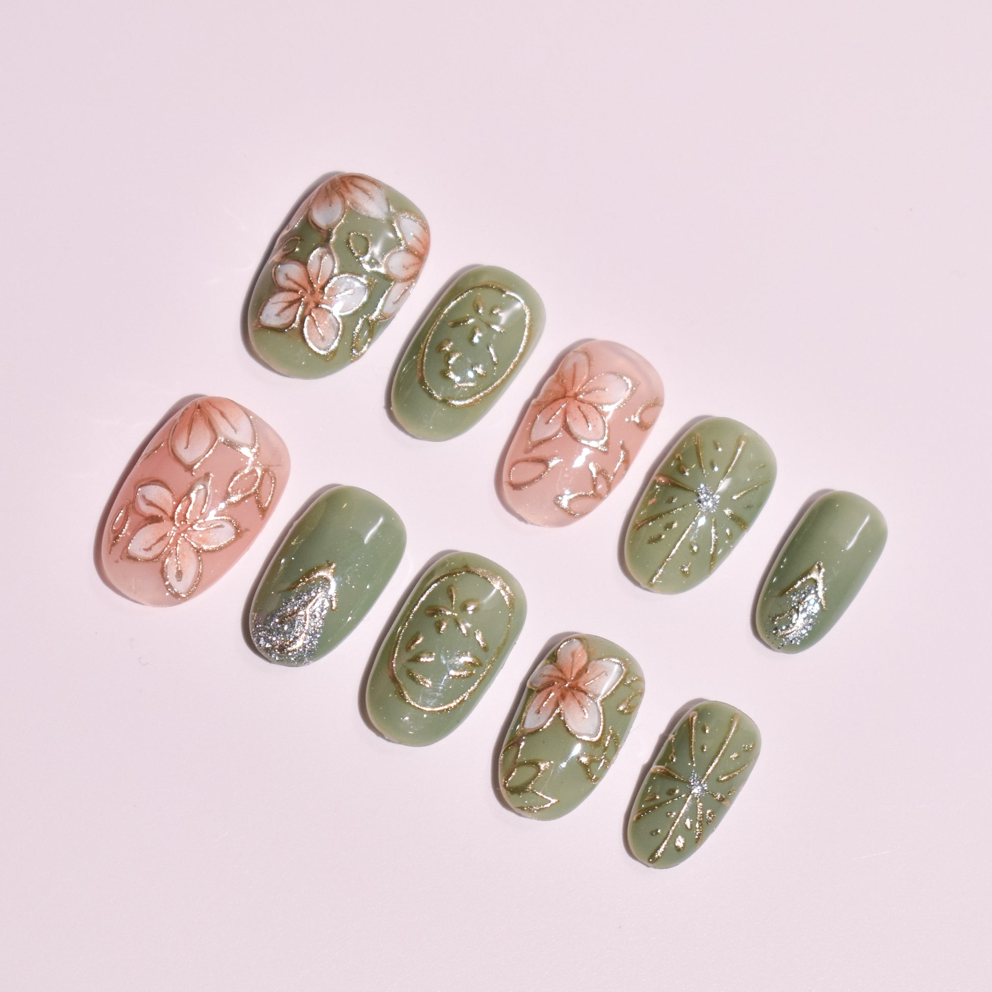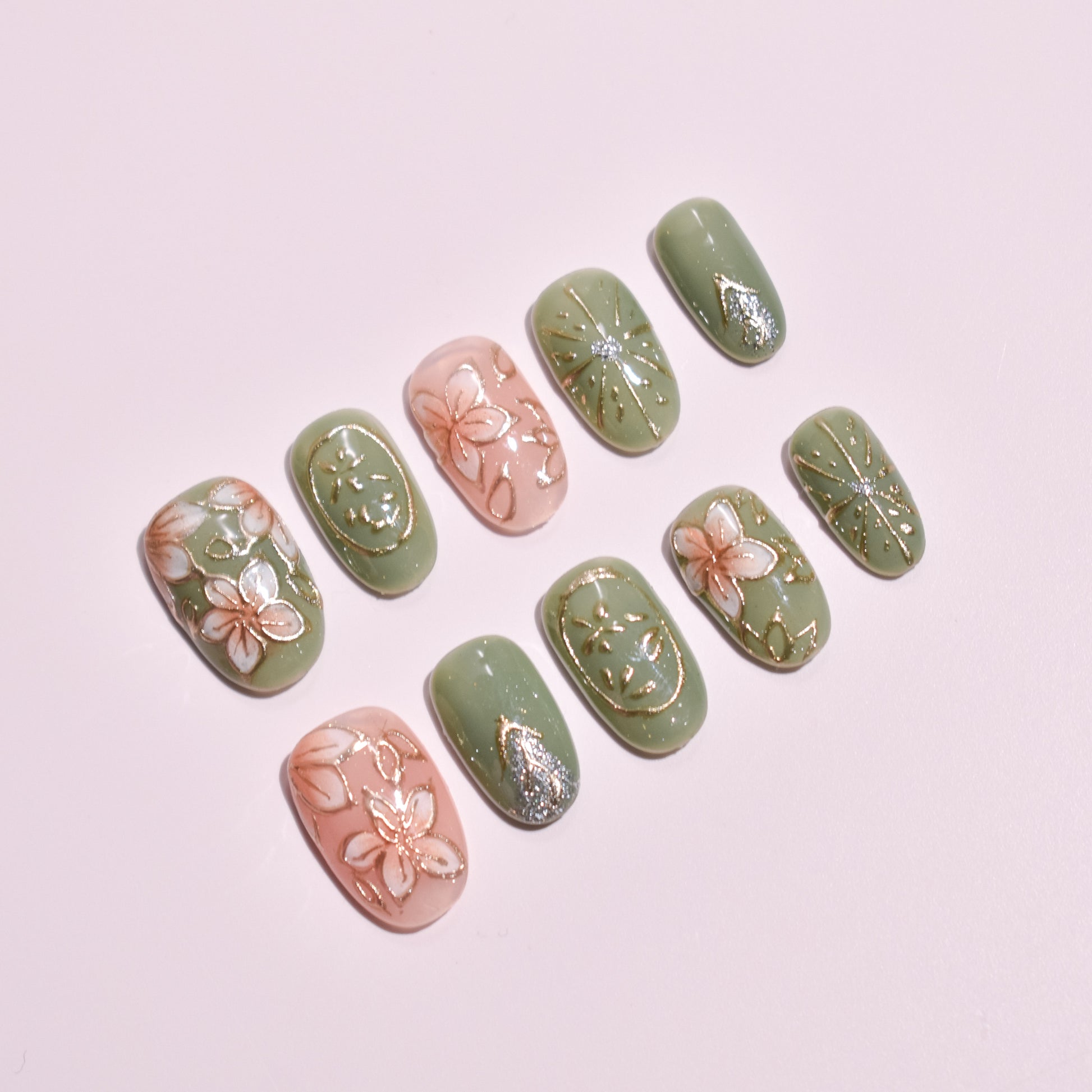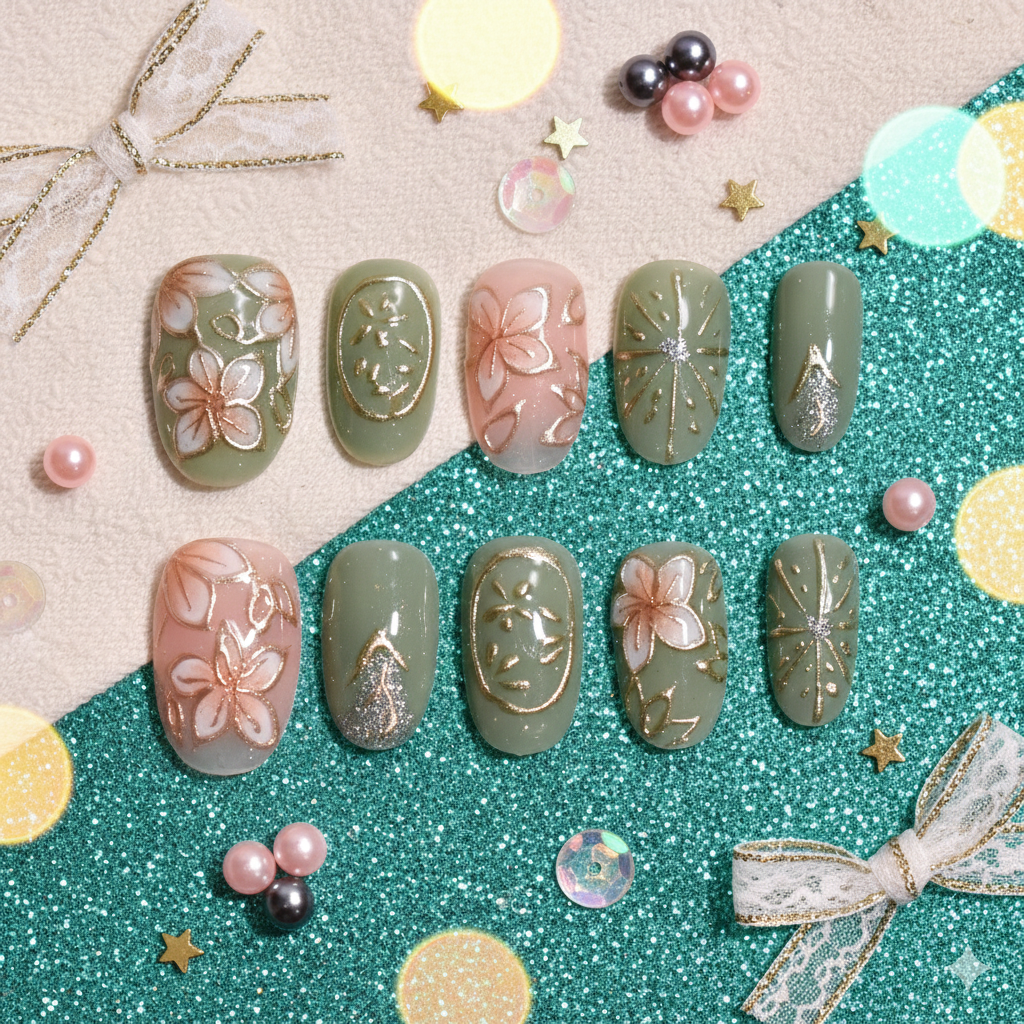 Elevate your everyday aesthetic with our Sakura Matcha Zen set, a premier example of Custom Japanese Nail Art. These Handmade Press-on Nails are meticulously crafted to bring the refined elegance of the Wafu Aesthetic to your personal style. Featuring a stunning mix of hand-painted floral motifs, raised 3D gold linework, and shimmering silver "firework" accents, this set transforms nail care into a wearable gallery.
