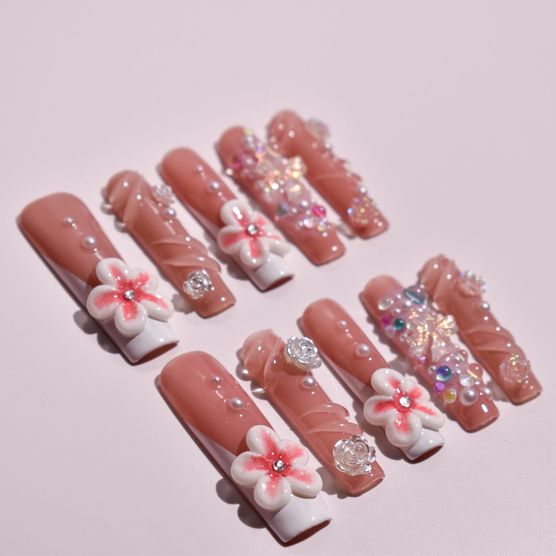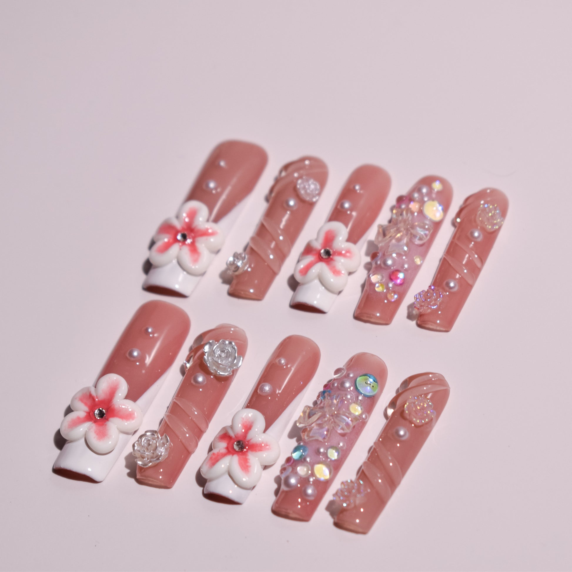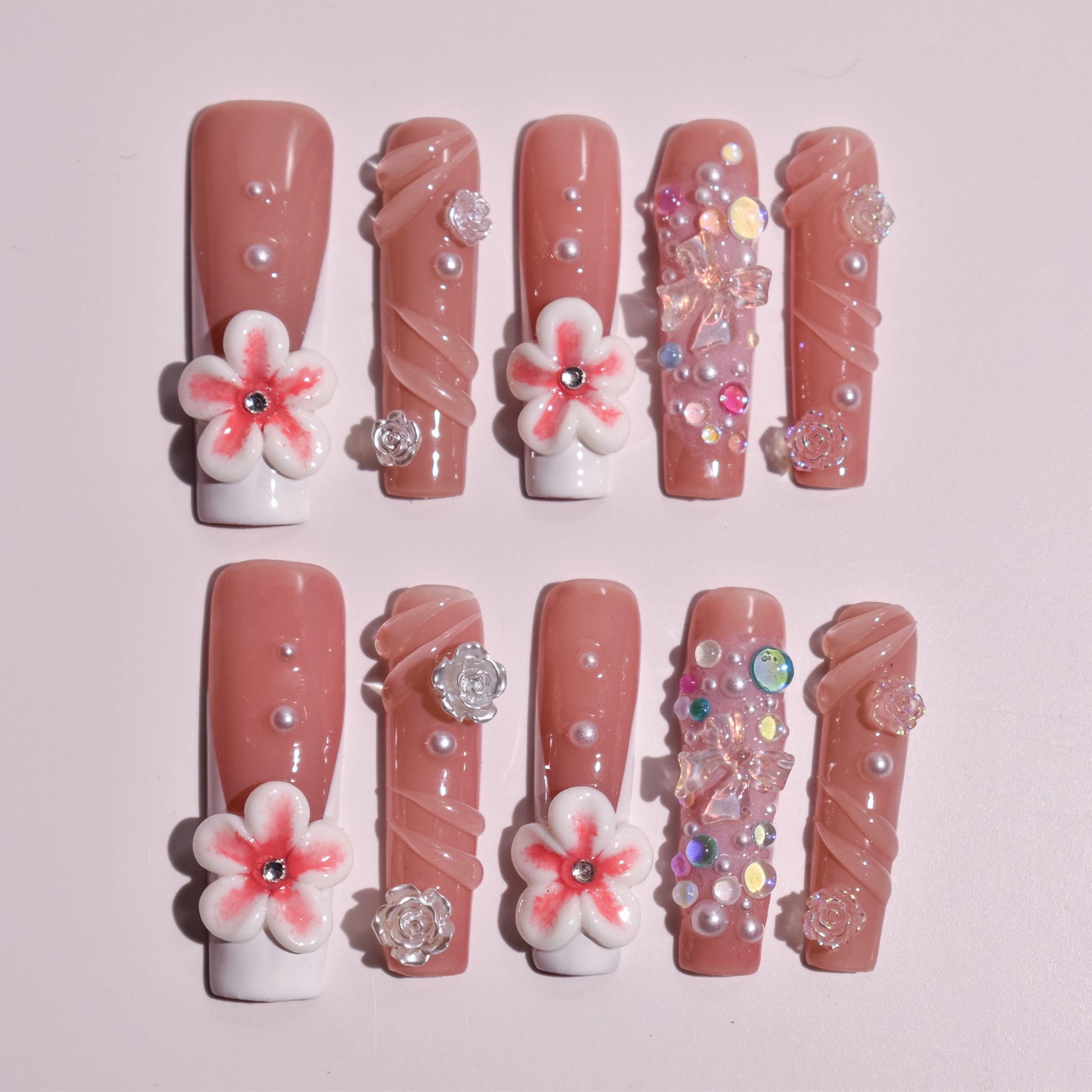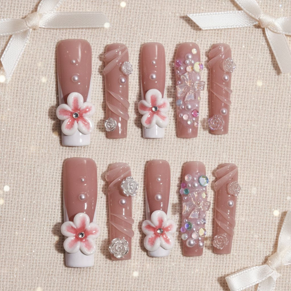 This set of Handmade Press-on Nails captures the ephemeral beauty of springtime through a sophisticated and highly tactile design. The color palette features a warm, semi-translucent honey-nude base paired with crisp white French tips, creating a clean and elevated foundation for the elaborate artwork. Sculpted into a Long Square silhouette, these nails provide the perfect canvas for a harmonious blend of traditional floral motifs and modern, trend-driven embellishments.