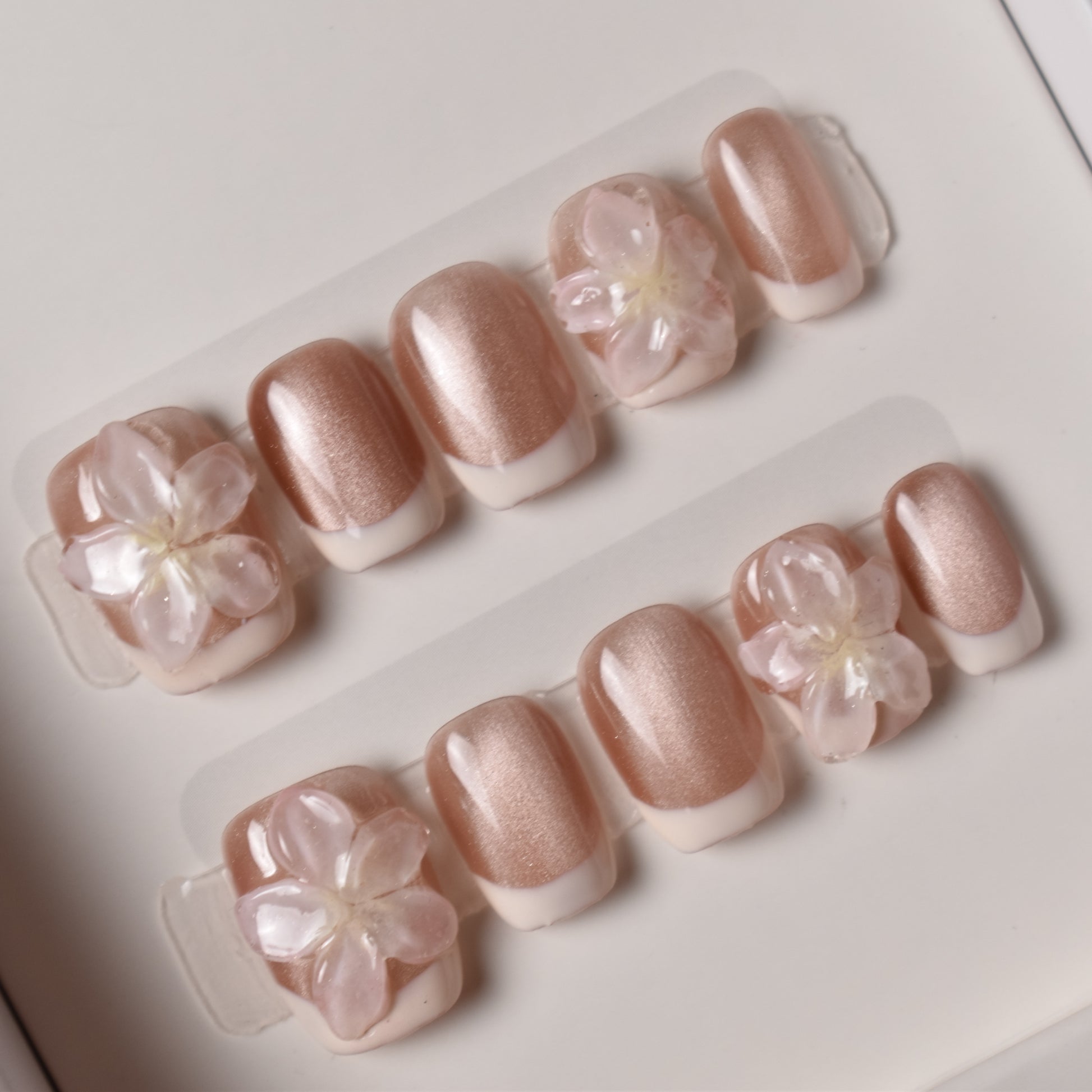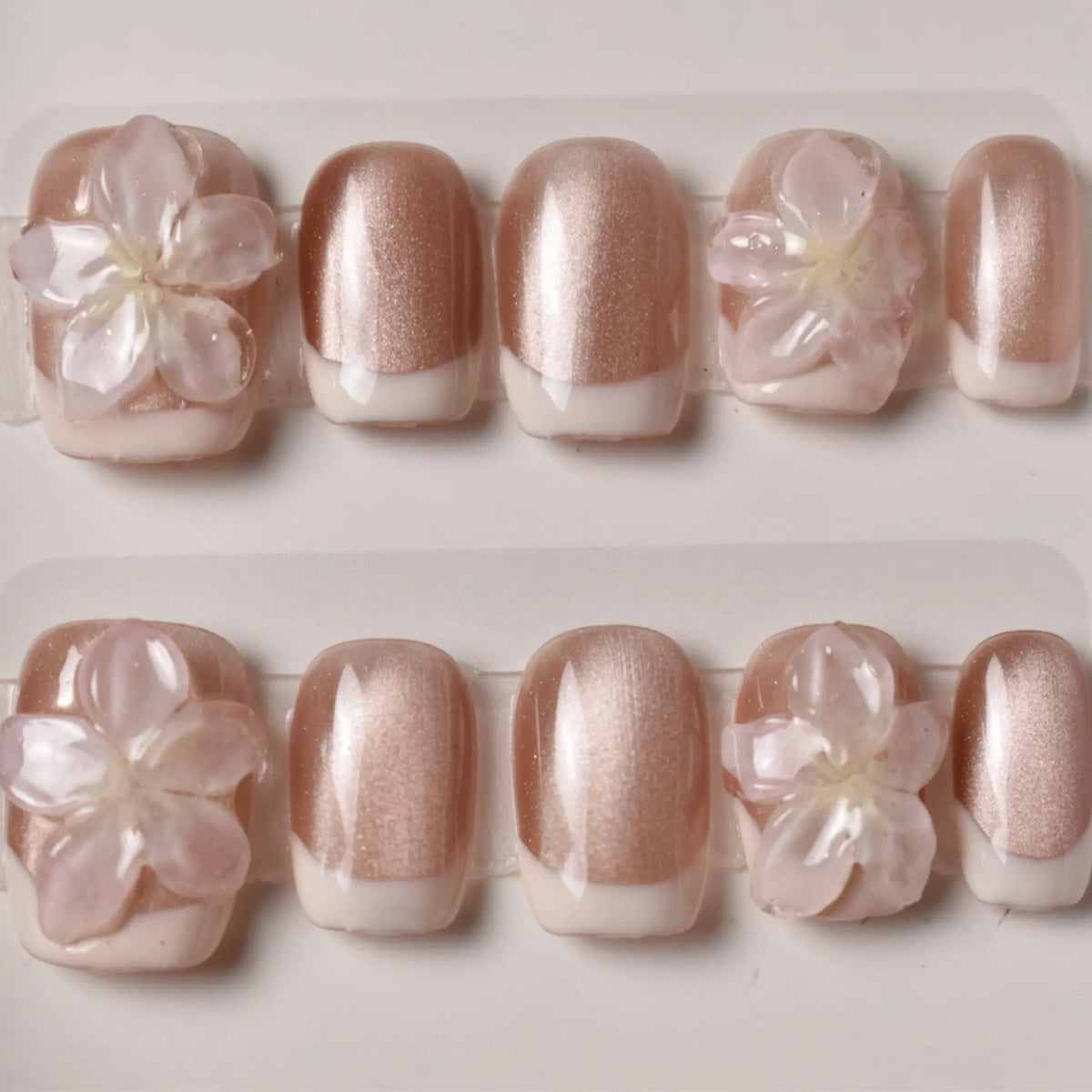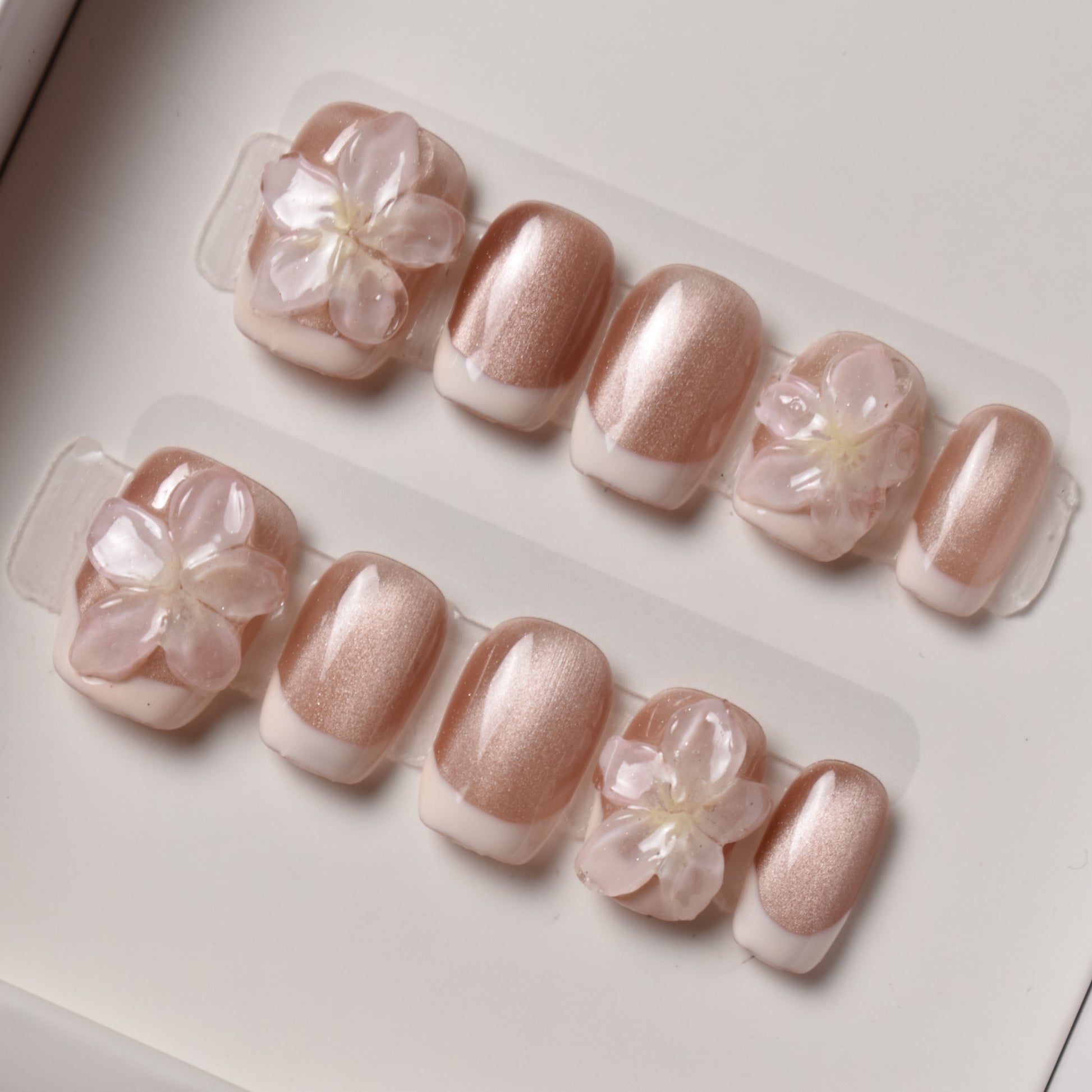 Soft rose-gold shimmer and creamy white tips are adorned with translucent floral sculptures, as if petals have been kissed by spring rain. A tender, romantic design for all seasons.