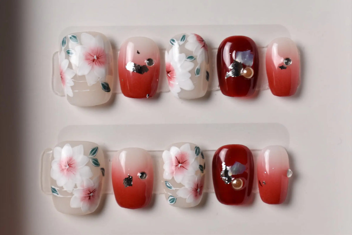 A romantic celebration of spring, Sakura no Yume captures the fleeting beauty of cherry blossoms in full bloom. Each nail features hand-painted white sakura petals with soft pink centers, accented by delicate green leaves that bring the floral design to life. The base alternates between a sheer milky nude and a smooth crimson-to-pale pink ombré, symbolizing the gentle transition from winter’s chill to spring’s warmth.