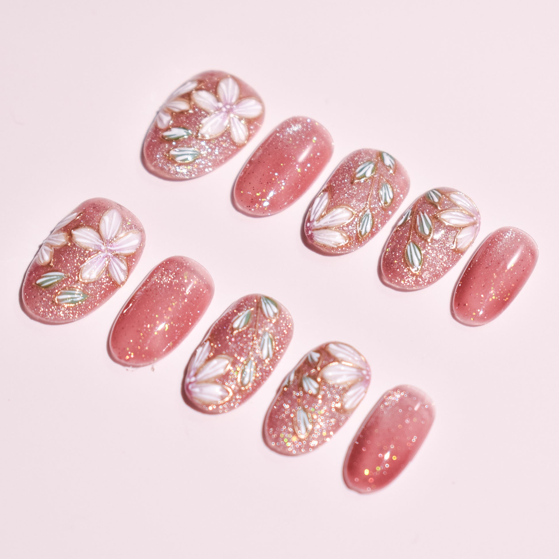 This design features a rosy pink glitter base layered with hand-painted white florals and delicate sage-green leaf accents. Subtle gold detailing and fine shimmer create a luminous, airy finish that feels romantic, feminine, and timeless. The medium oval shape offers a natural, flattering silhouette that enhances the hands while remaining comfortable for everyday wear.