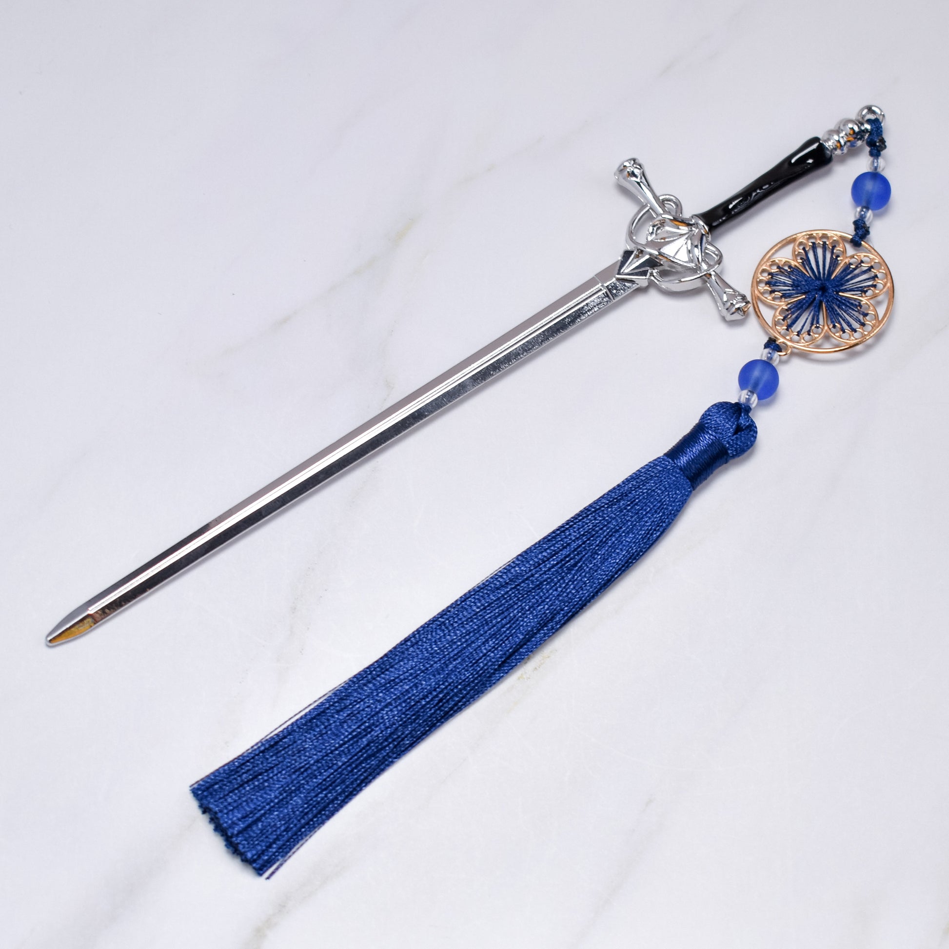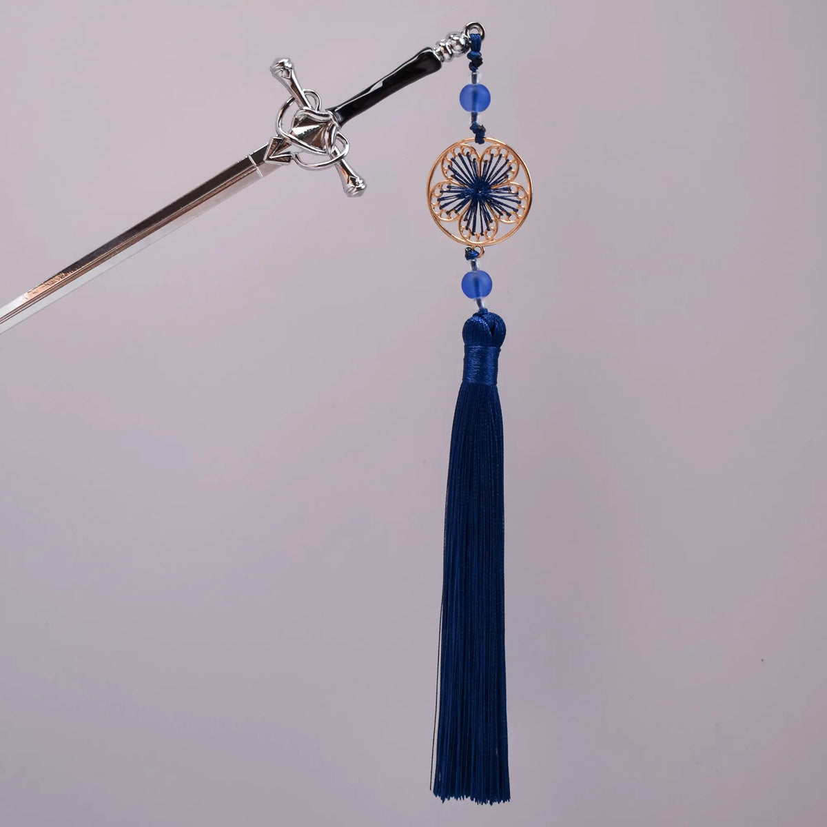 The polished silver sword hairpin paired with a sleek black handle forms a timeless silhouette. Hanging gracefully below is a gold-framed sakura medallion, embroidered with deep sapphire-blue thread to symbolize wisdom, confidence, and inner strength.