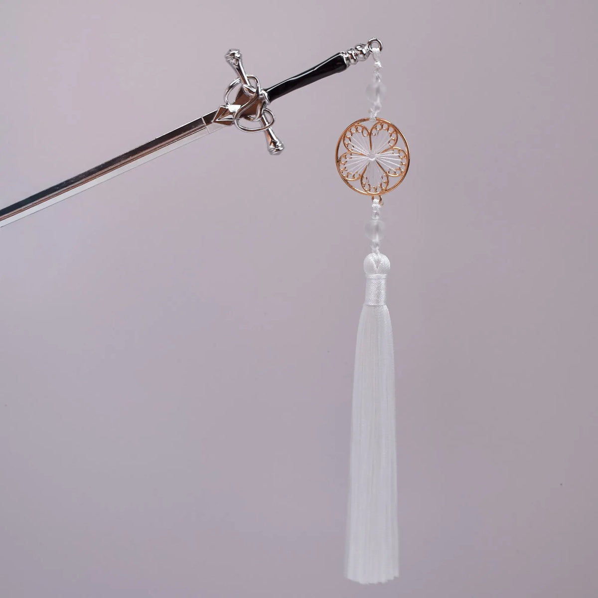 Sakura Snow Sword Hairpin – White Tassel & Gold Filigree Charm