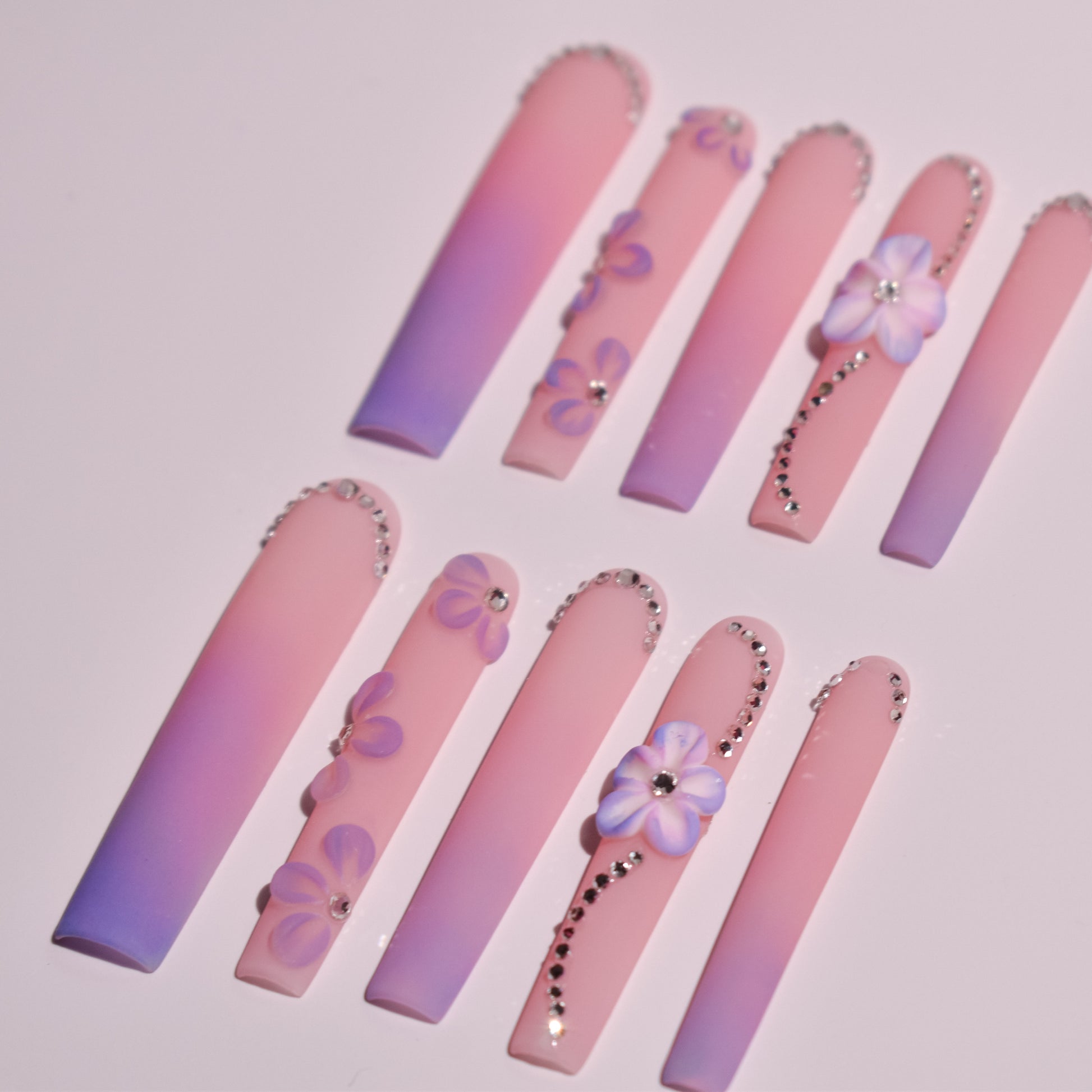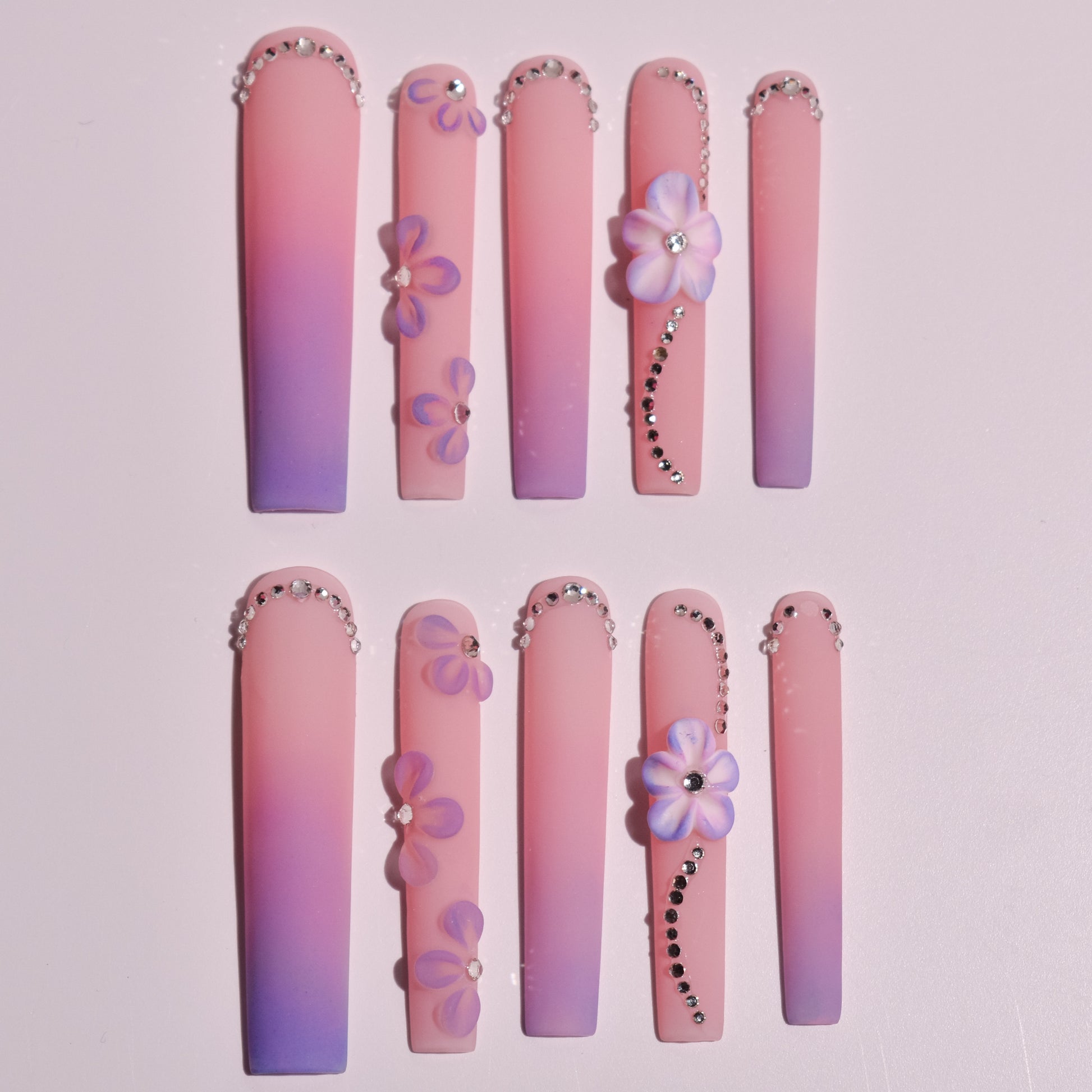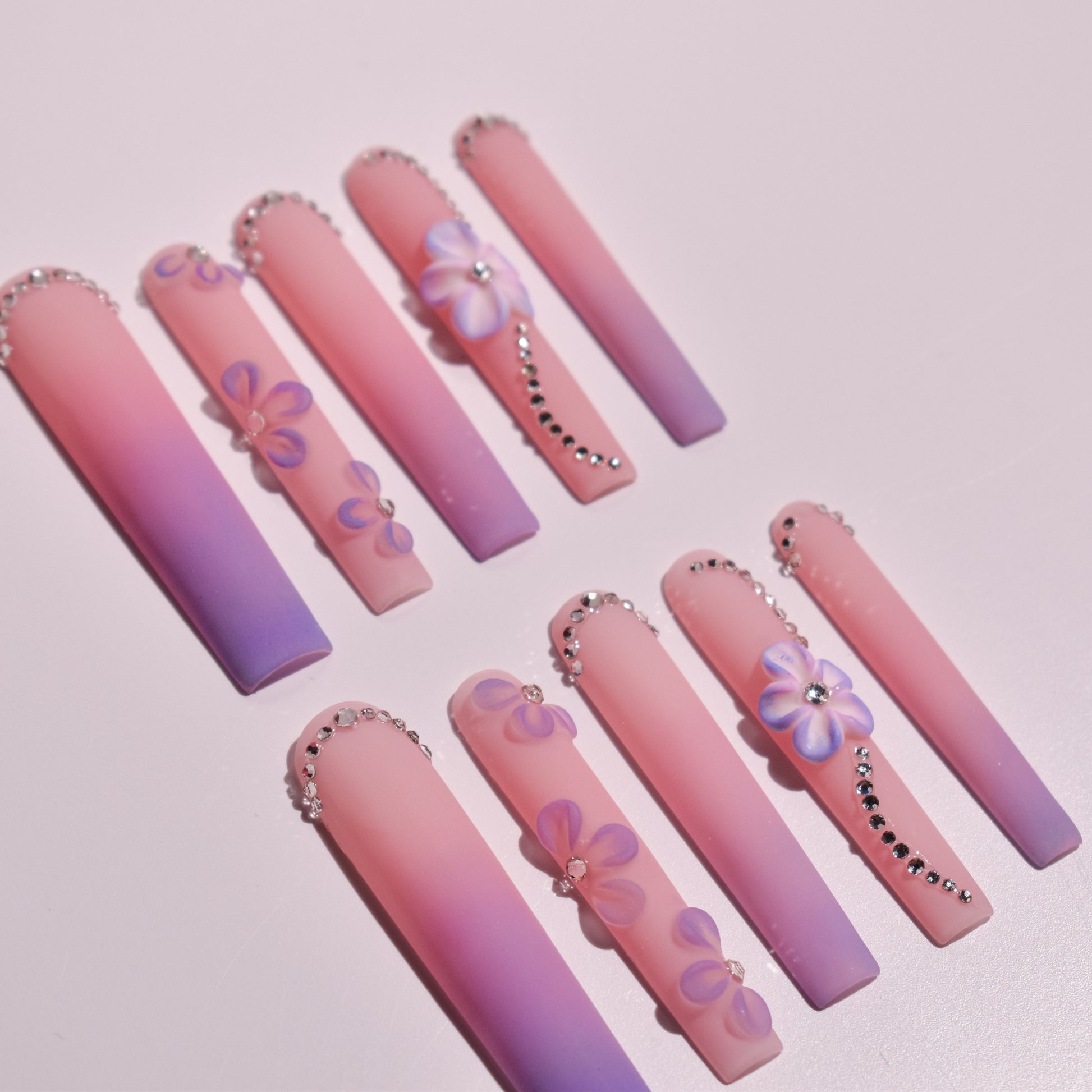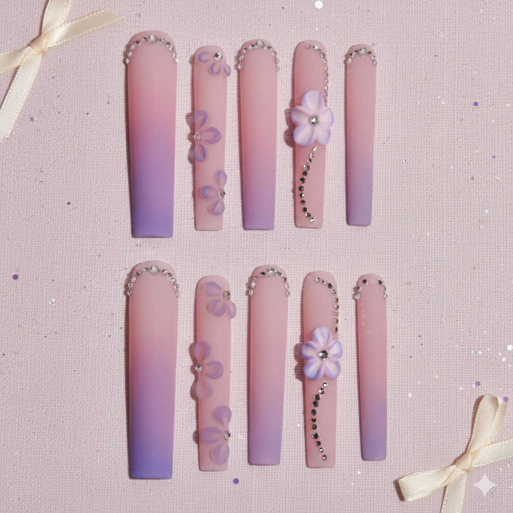 The set features a seamless hand-painted gradient that shifts from a warm, blush pink at the cuticle to a cool, ethereal lavender at the tips. This ombré base is elevated by intricate 3D sculpted gel florals, where each petal is carefully layered to create a realistic, tactile texture. The design is further enhanced with hand-placed crystalline embellishments that trace the natural curves of the nail and nestle within the floral centers. A refined matte finish provides a velvety, sophisticated texture, allowing the sparkling accents and dimensional artwork to truly command the light.