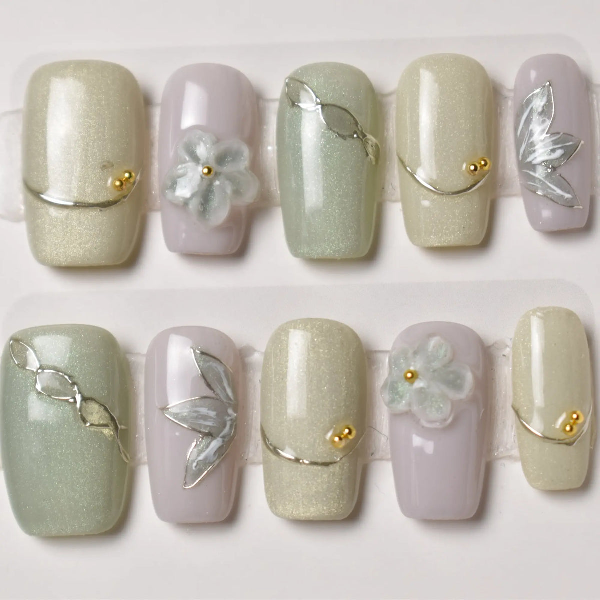 Misty sage and lilac shimmers are linked by silver vines, petite gold studs, and soft 3D blossoms, capturing the calm grace of early spring leaves and tea-ceremony serenity.