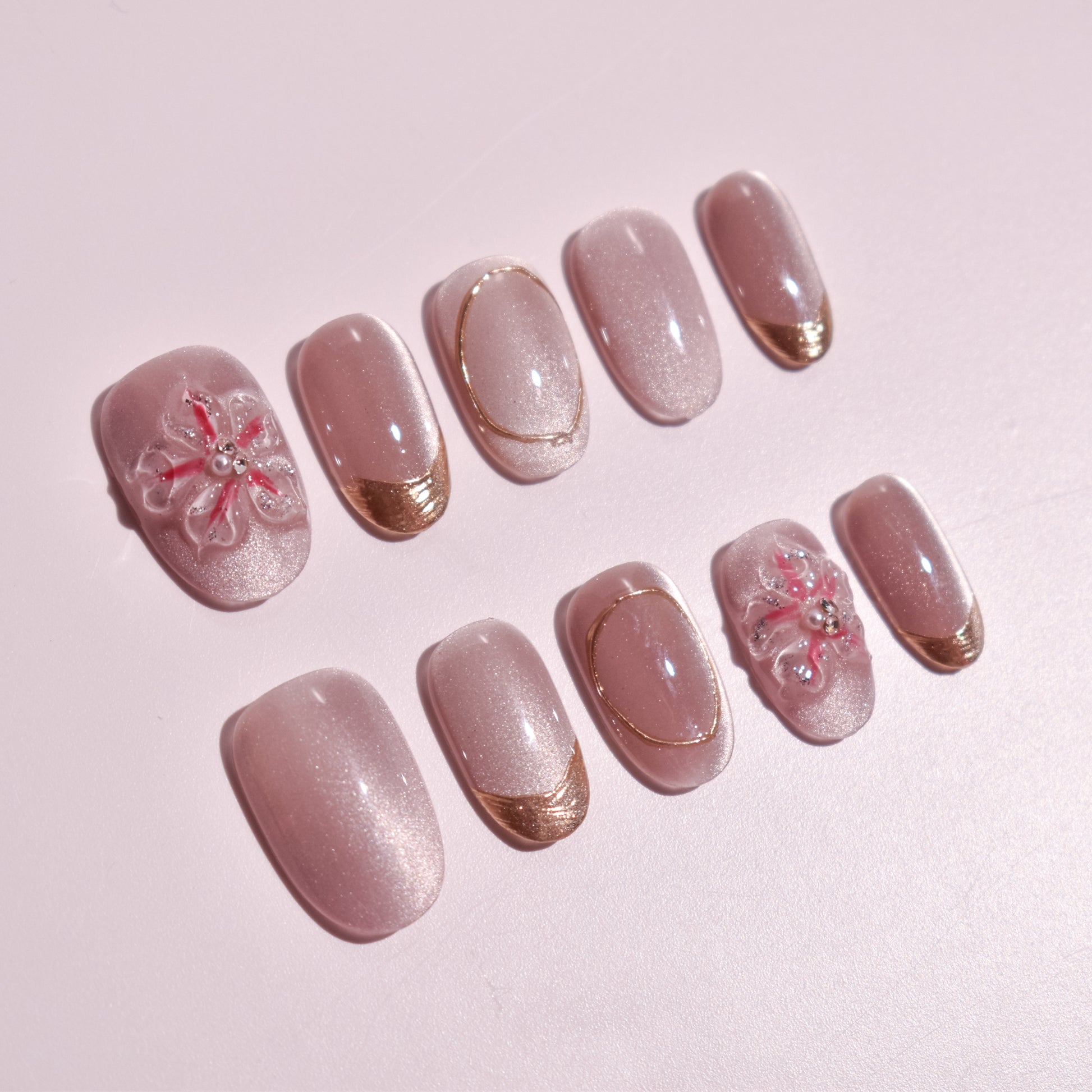 Subtle shimmer gives the nails a glowing, silk-like finish, while minimalist gold details and raised floral art add dimension without overpowering the look. Perfect for bridal moments, everyday elegance, or anyone who loves clean, polished beauty with a Japanese-inspired touch.
