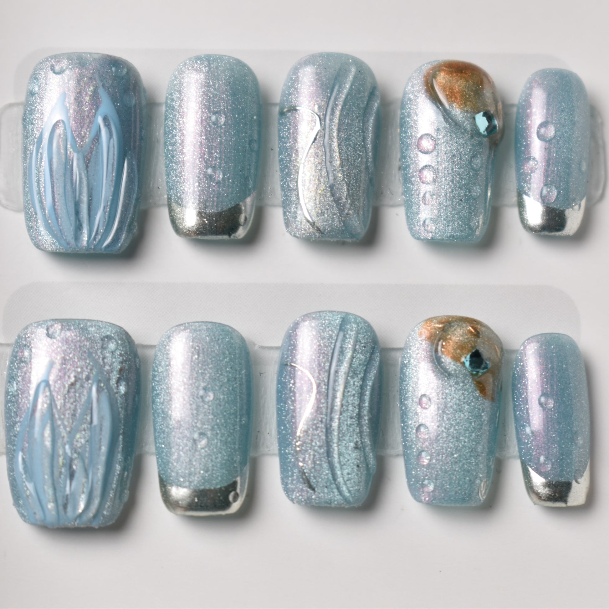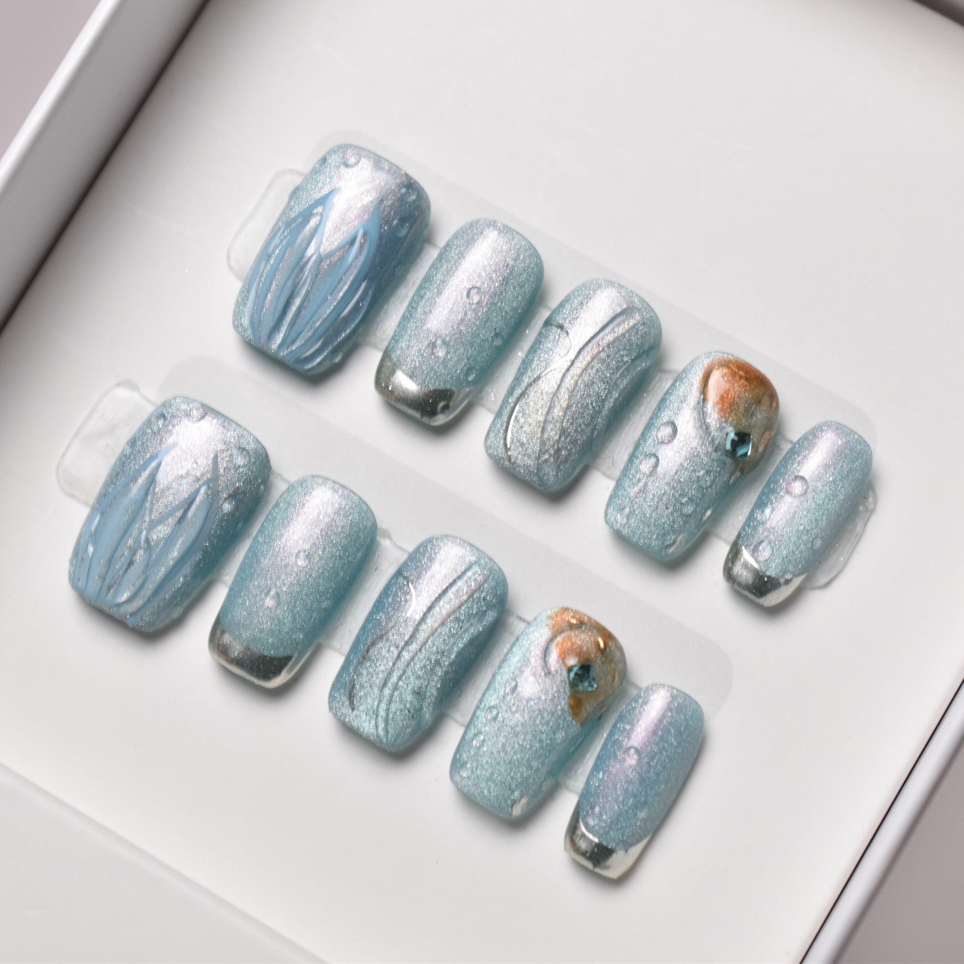 - 10 uniquely designed, hand-painted press-on nails made with high-quality UV gel.