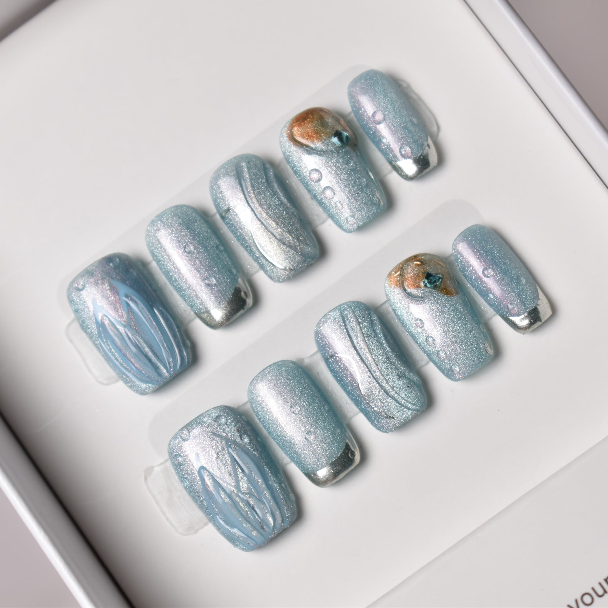 Cool aqua tones sparkle with iridescence, sculpted into flowing wave-like patterns. Touches of gold and jewel accents glint like sunlight on ocean spray. Perfect for summer getaways, beachside elegance, and moments when the sea calls to your heart.