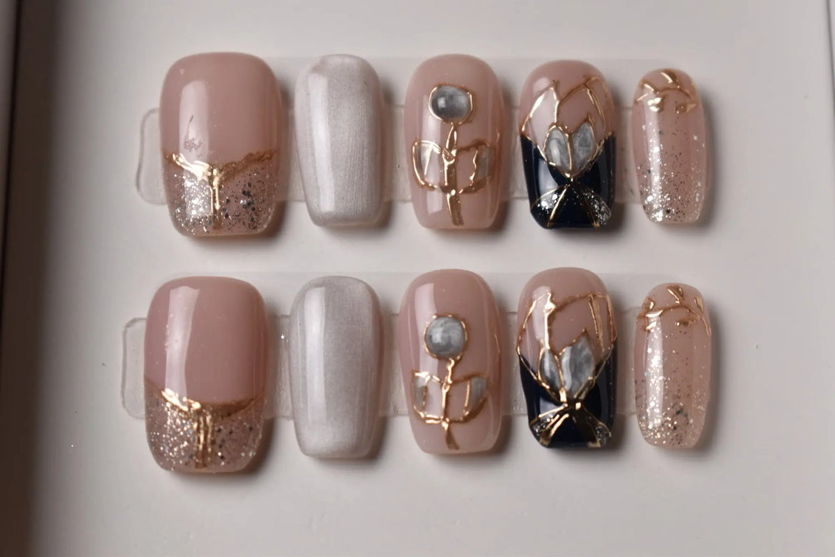 - 10 uniquely designed, hand-painted press-on nails made with high-quality UV gel.