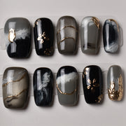 A high-gloss black gel melts into smokey gray gradients, layered with hand-brushed white swirls reminiscent of traditional Japanese suminagashi ink marbling. Thin metallic gold lines and tiny foil floral accents add a touch of quiet luxury against the moody, inky backdrop.