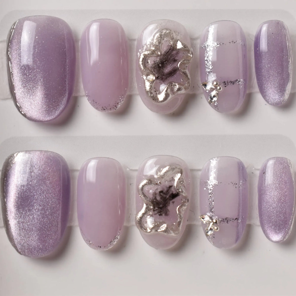- 10 uniquely designed, hand-painted press-on nails made with high-quality UV gel.