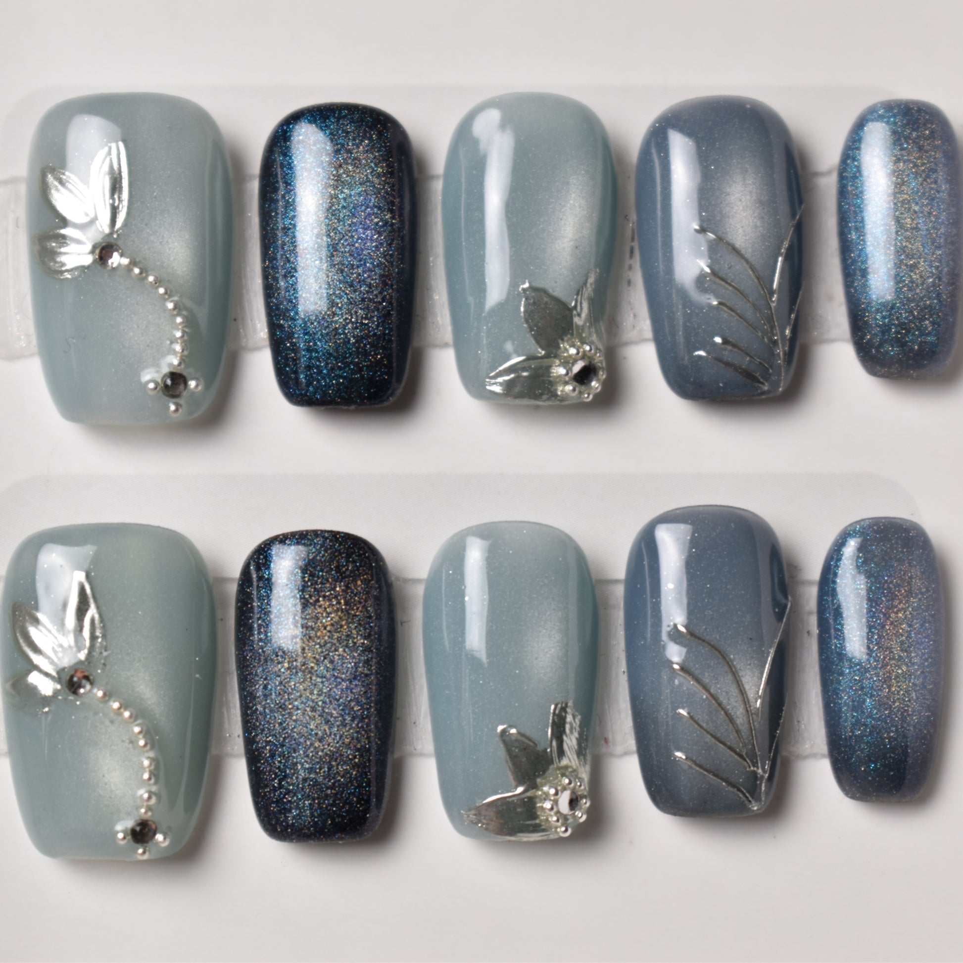 - 10 uniquely designed, hand-painted press-on nails made with high-quality UV gel.