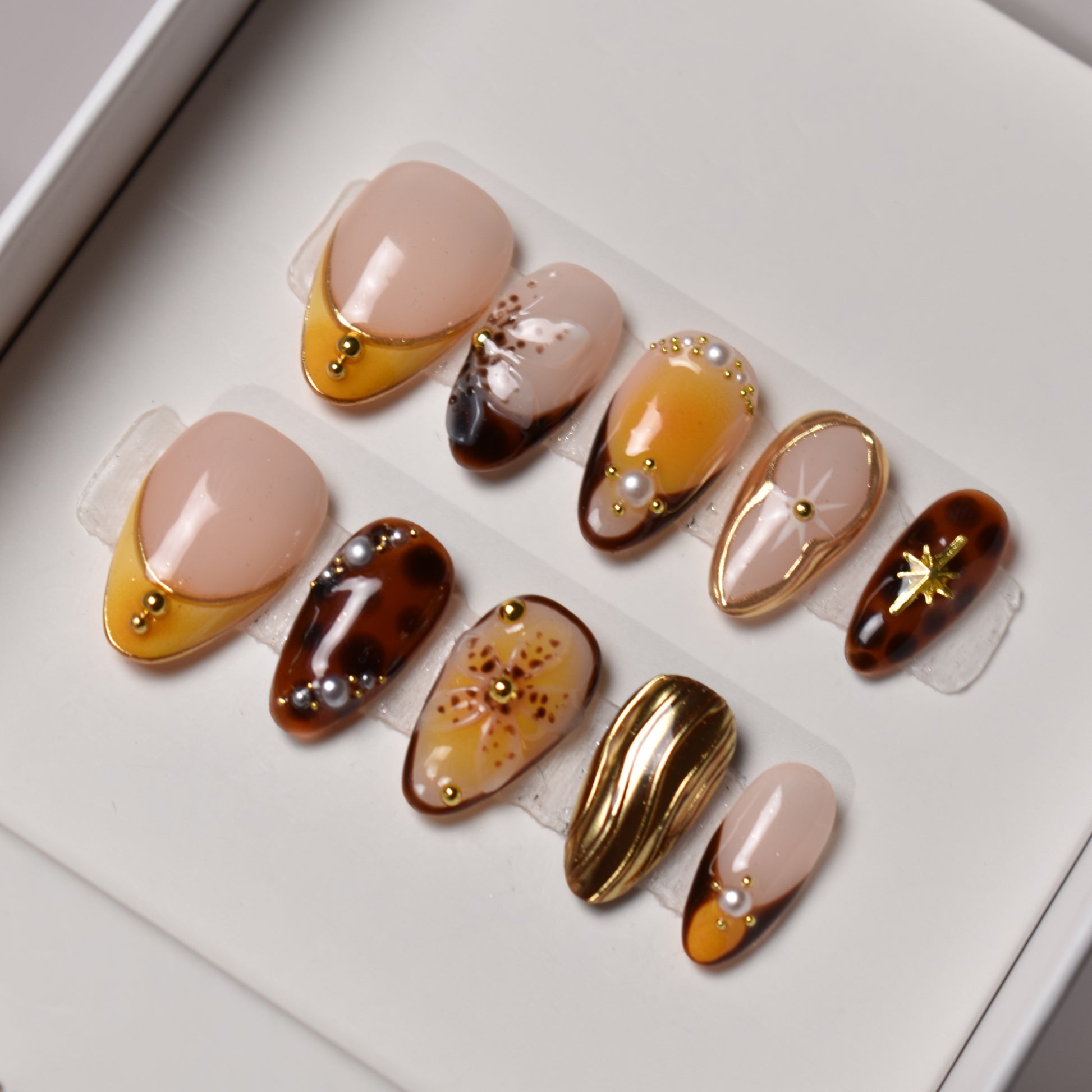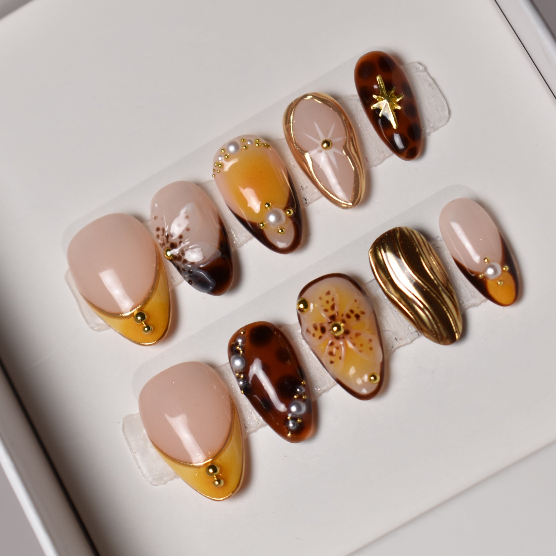 Bold amber gradients blend into rich tortoiseshell, glimmering under golden starbursts and luminous pearls. Each nail feels like a fragment of a moonlit jungle, alive with quiet strength and feline grace. Perfect for nights when your spirit demands to be seen.