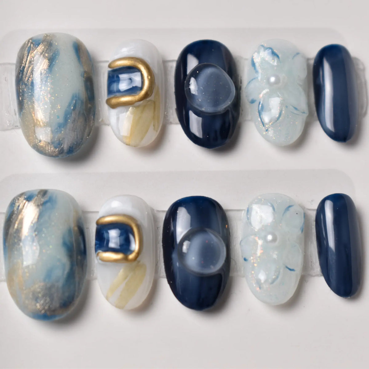 - 10 uniquely designed, hand-painted press-on nails made with high-quality UV gel.