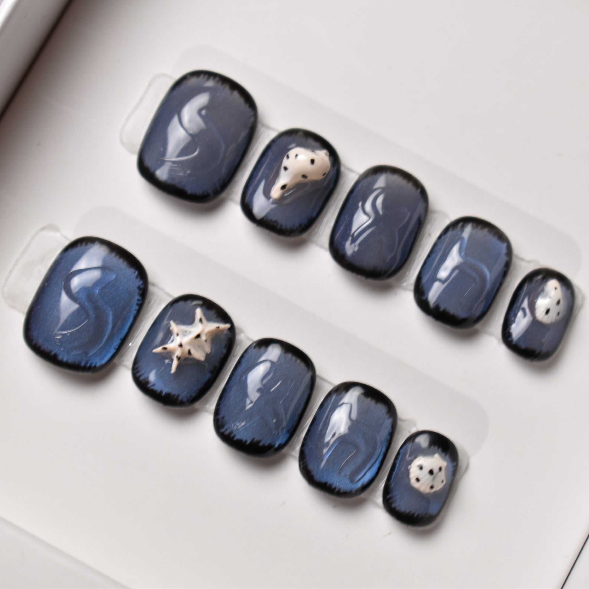 - 10 uniquely designed, hand-painted press-on nails made with high-quality UV gel.
