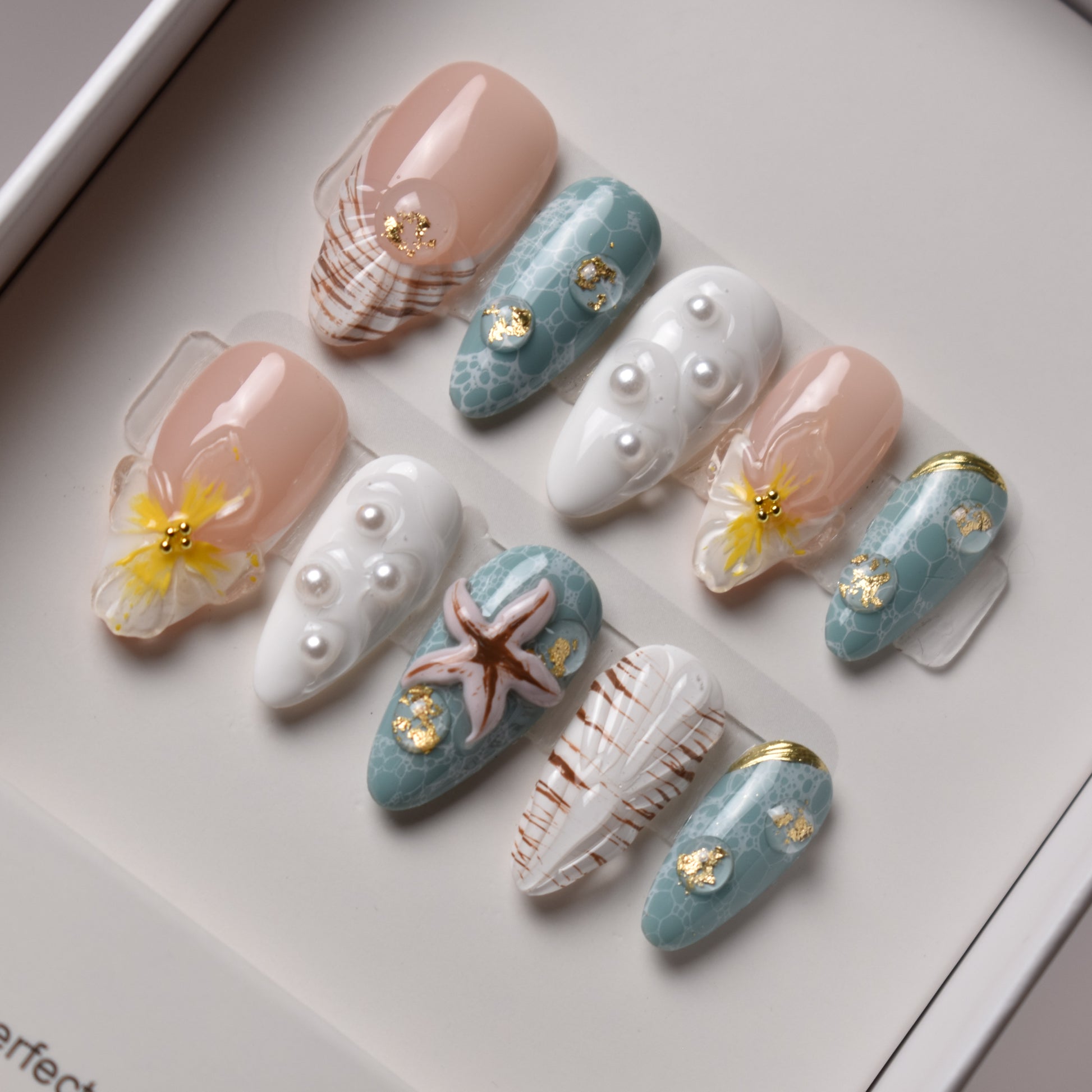 Gentle teal patterns reminiscent of ocean waves pair with sandy nudes and crisp whites. Starfish, yellow blooms, and golden accents capture the sunlit shore, while pearl details echo the rhythm of the tide. Perfect for coastal escapes and ocean lovers.
