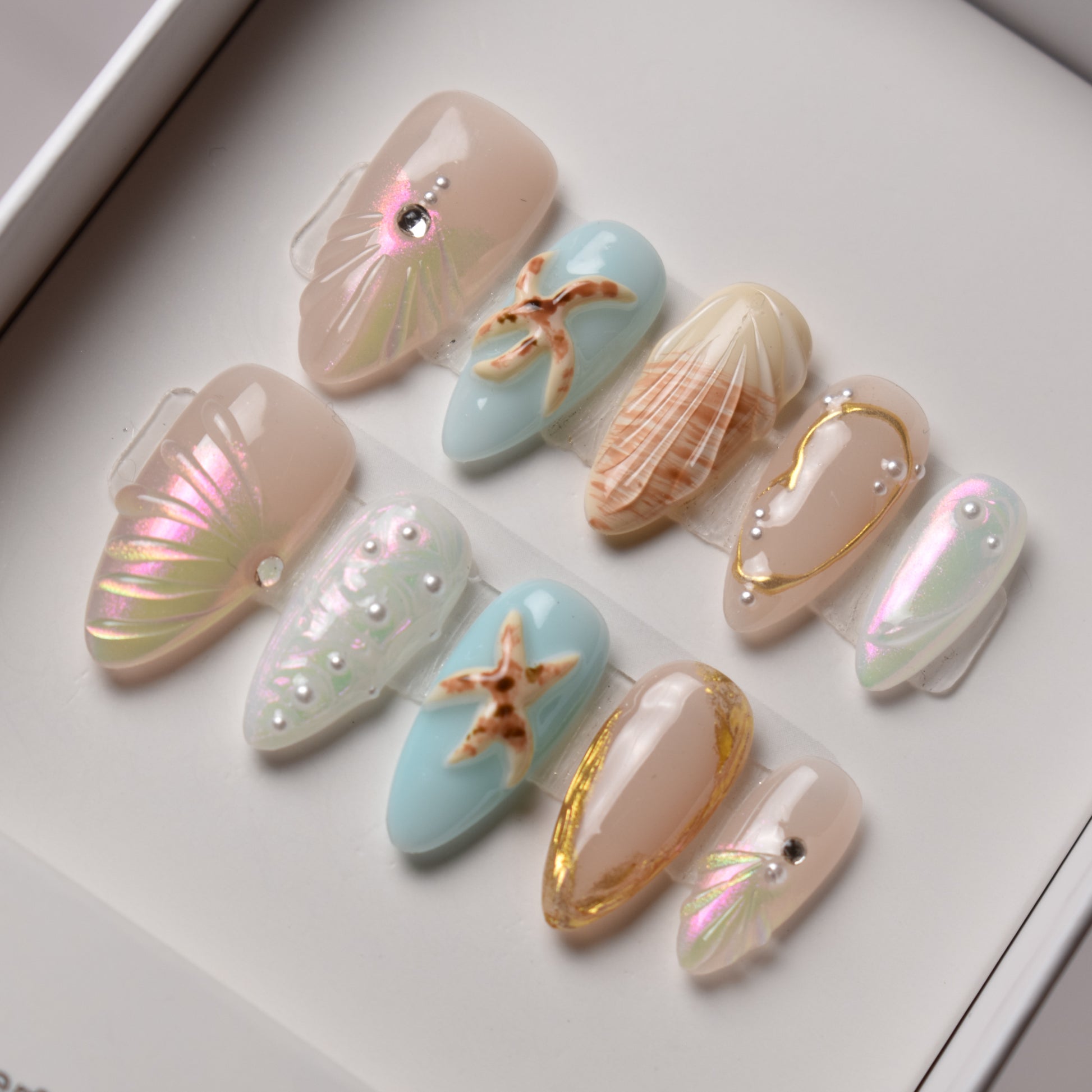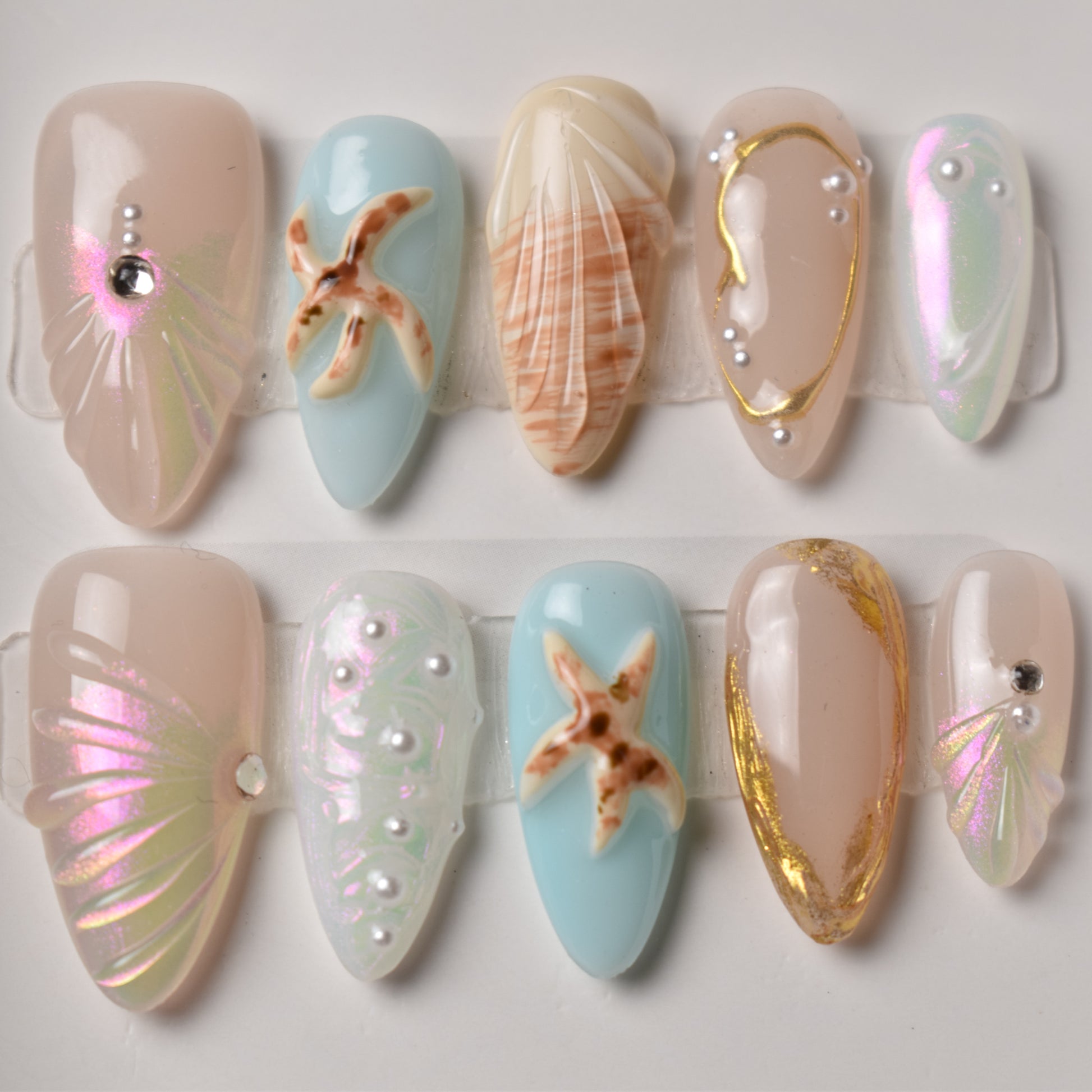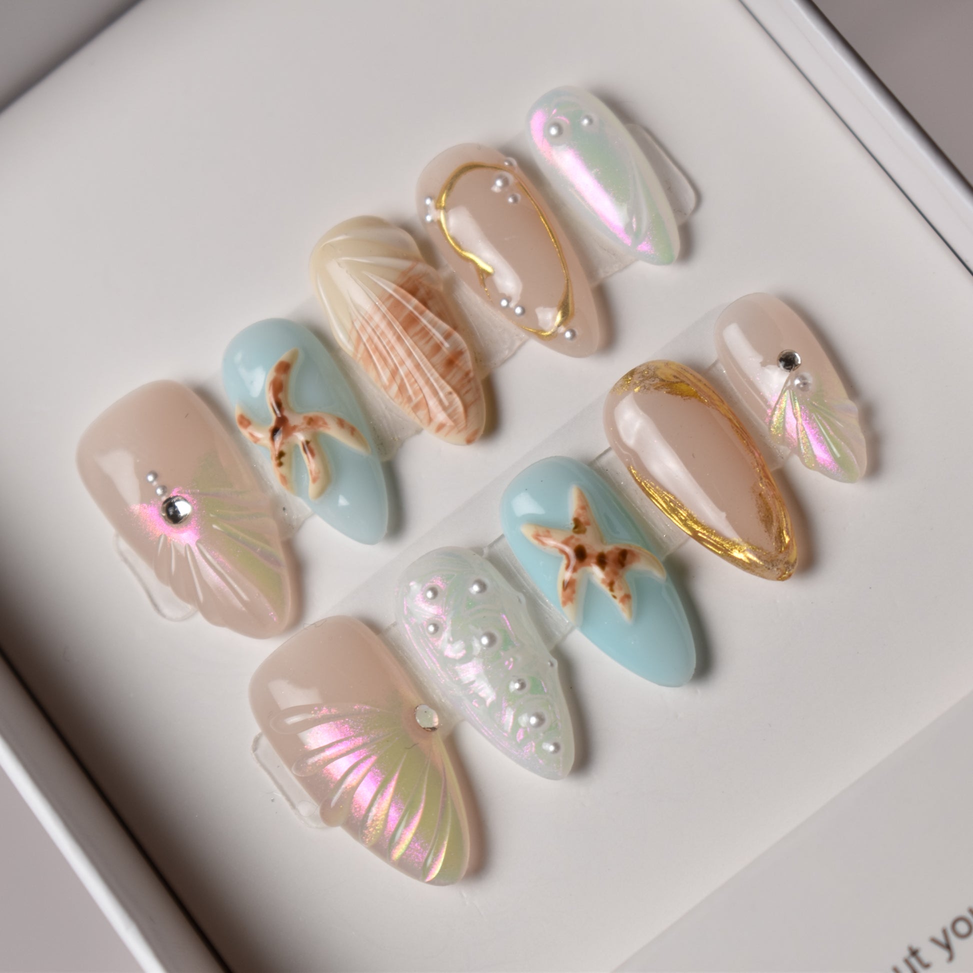 A seaside daydream comes to life with seashell patterns, starfish accents, and iridescent mermaid scales in soft pastel hues. Nude and turquoise tones blend with golden details, perfect for beach holidays, summer adventures, and capturing the magic of the ocean.