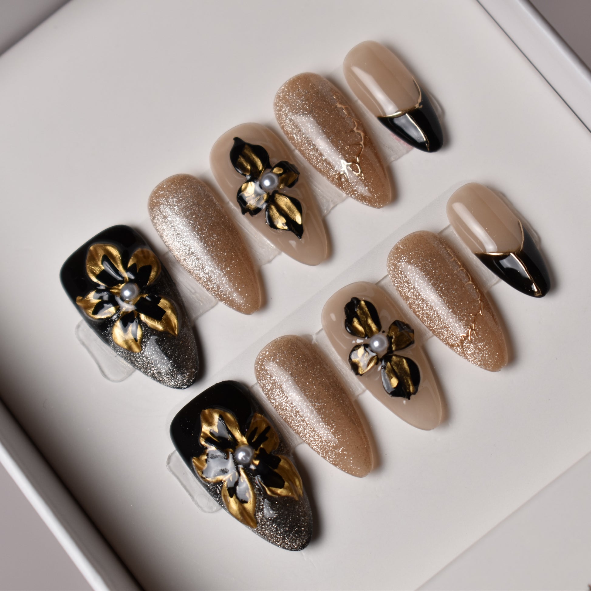 Bold black and sparkling champagne gold form the canvas for striking golden-petaled flowers with pearl centers. The shimmering textures and refined color palette exude confidence and power, perfect for formal occasions, high-fashion statements, and moments of unapologetic glamour.